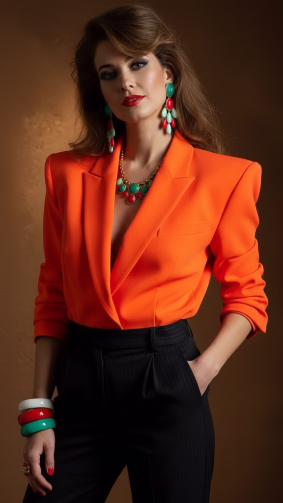Die Silhouette der 80er war kraftvoll. Breite Schultern, schmale Taille und klare Linien bestimmten das Erscheinungsbild. Dieser Look sollte Stärke und Selbstbewusstsein vermitteln – besonders im beruflichen Kontext.
