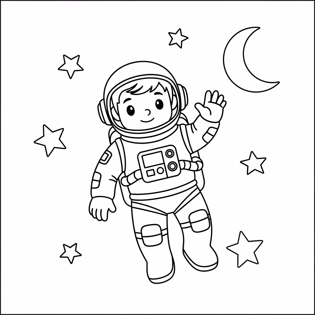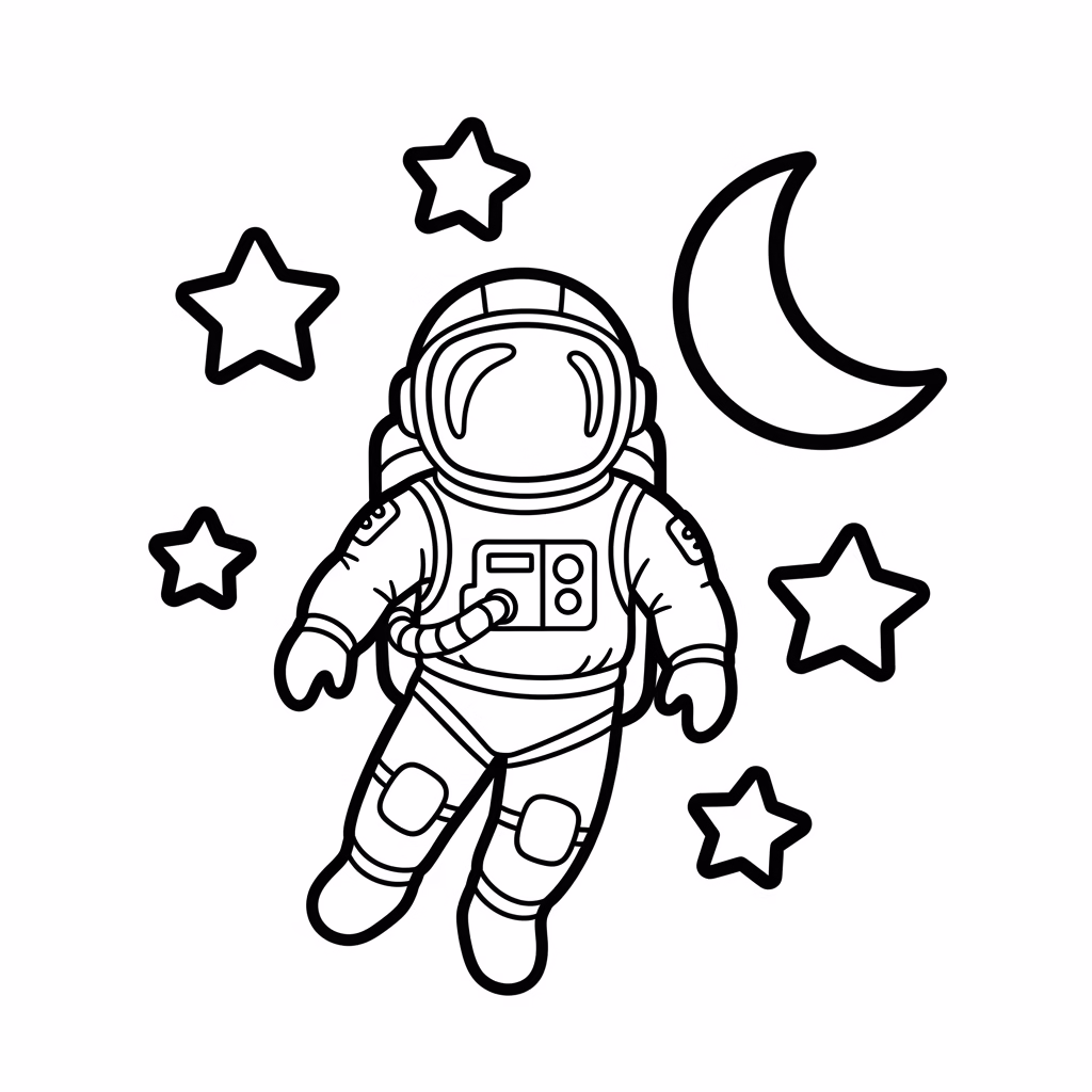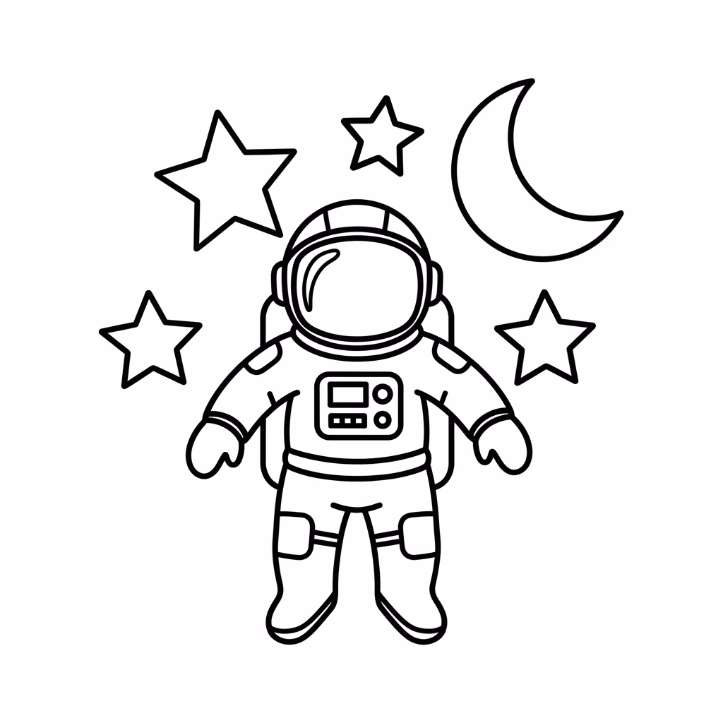 Einfach gehaltene Astronaut-Ausmalbilder sind besonders für jüngere Kinder geeignet. Große Flächen und klare Konturen ermöglichen selbstständiges Arbeiten.