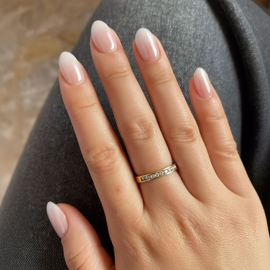 Die Eleganz entsteht durch den sanften Farbverlauf und die reduzierte Form. Kurze Nägel lenken den Blick auf die weiche Optik des Designs, ohne zu dominieren. Das Design fügt sich harmonisch in das Gesamtbild der Hände ein.