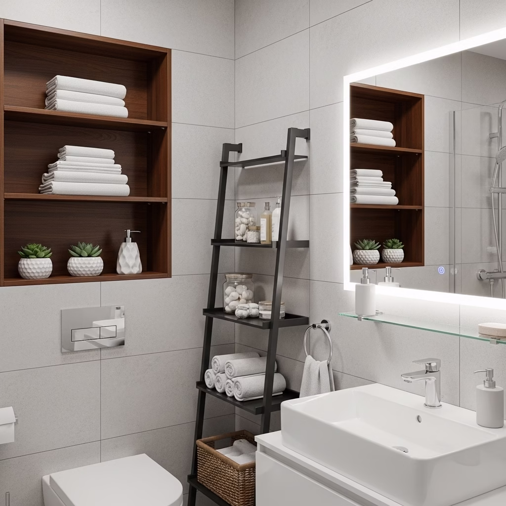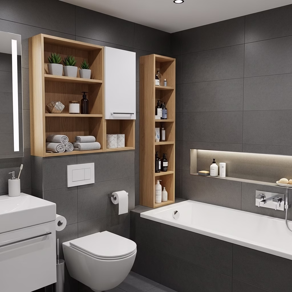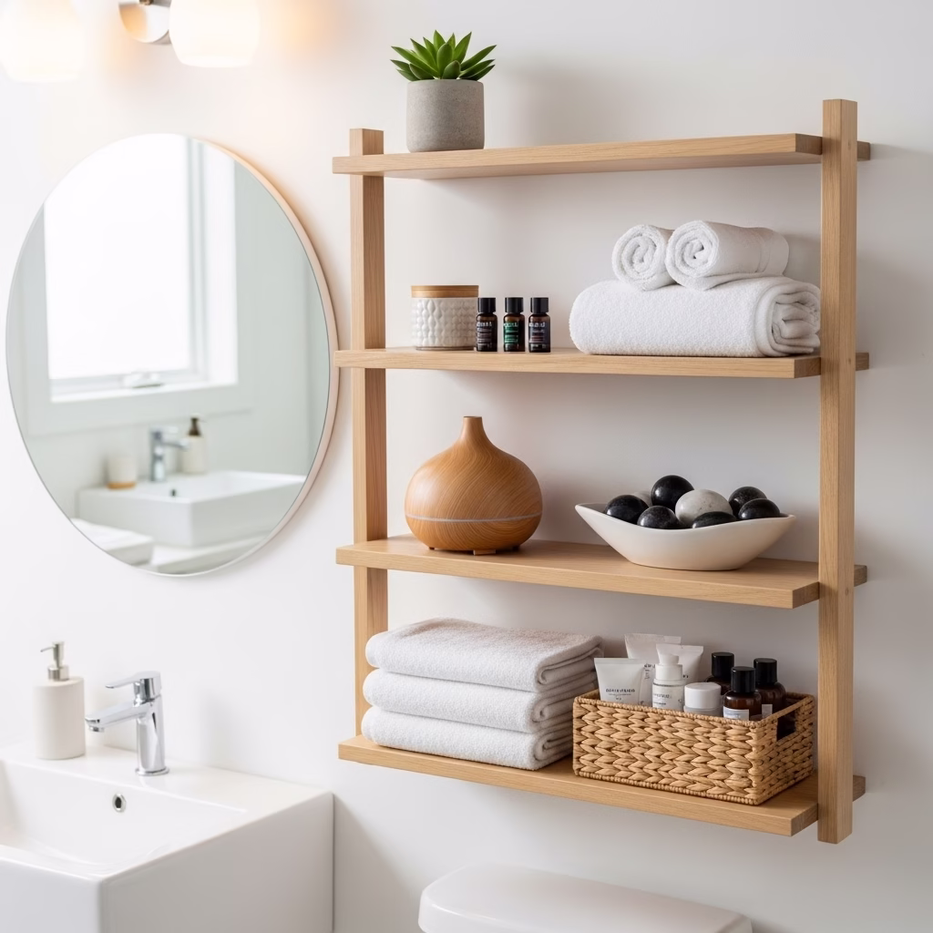 Moderne Badezimmer Regale wirken nicht streng. Sie unterstützen Ordnung, ohne den Raum kühl erscheinen zu lassen.