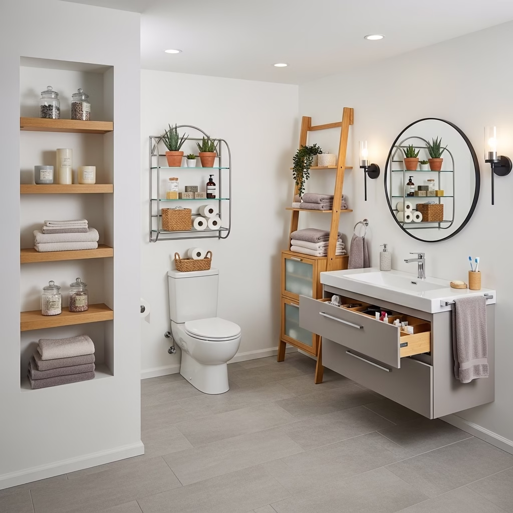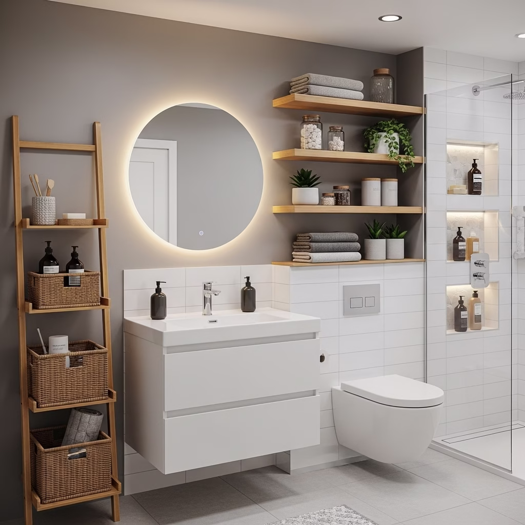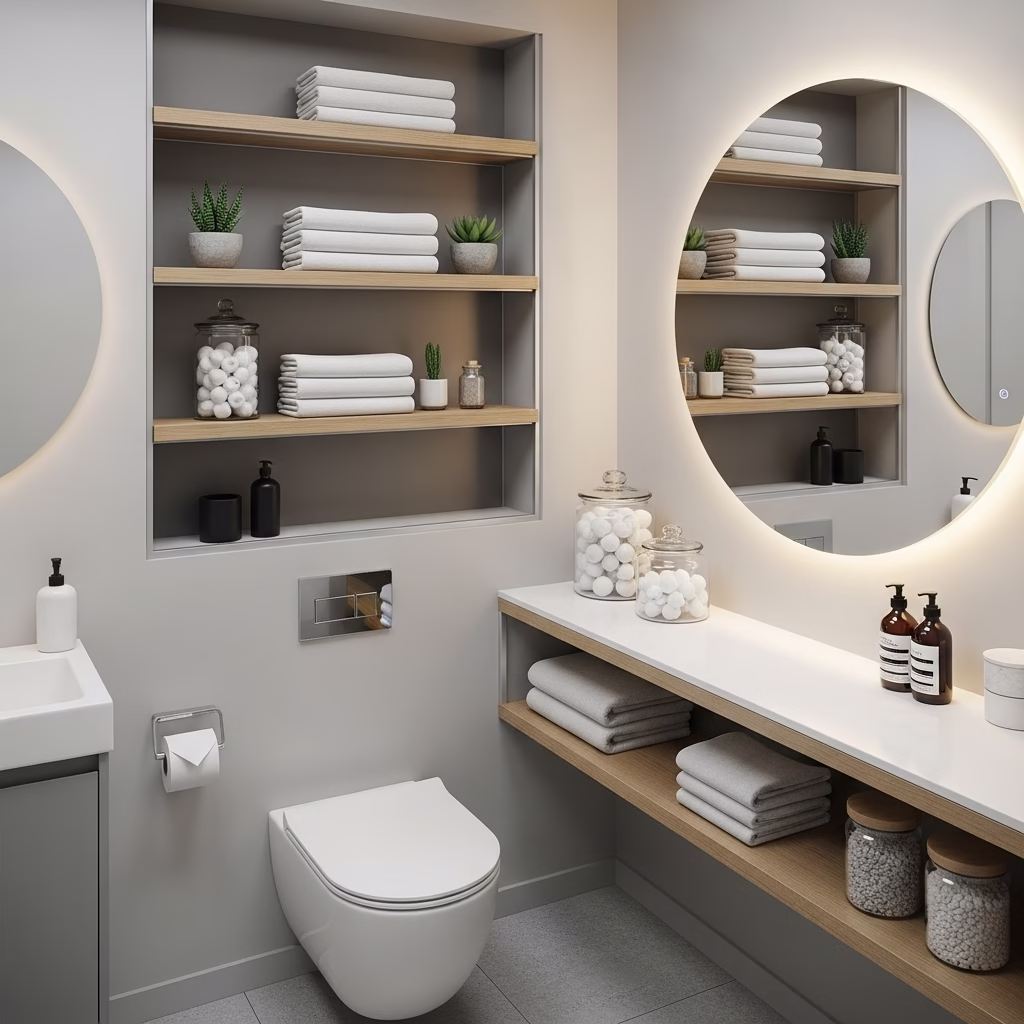 Moderne Badezimmer Regale wirken nicht streng. Sie unterstützen Ordnung, ohne den Raum kühl erscheinen zu lassen.