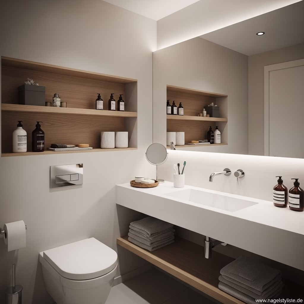Licht beeinflusst die Wirkung von Regalen stark. Beleuchtete Flächen wirken leichter und schaffen Tiefe. Das Zusammenspiel von Licht und Struktur verleiht dem Badezimmer Eleganz.