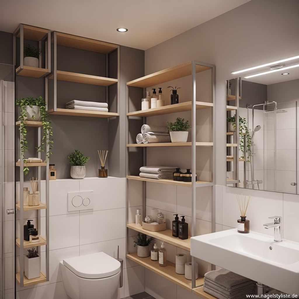 Die Materialwahl spielt bei Badezimmer Regalen eine entscheidende Rolle. Hochwertige Oberflächen, matte Strukturen und harmonische Farben verleihen dem Raum Tiefe.