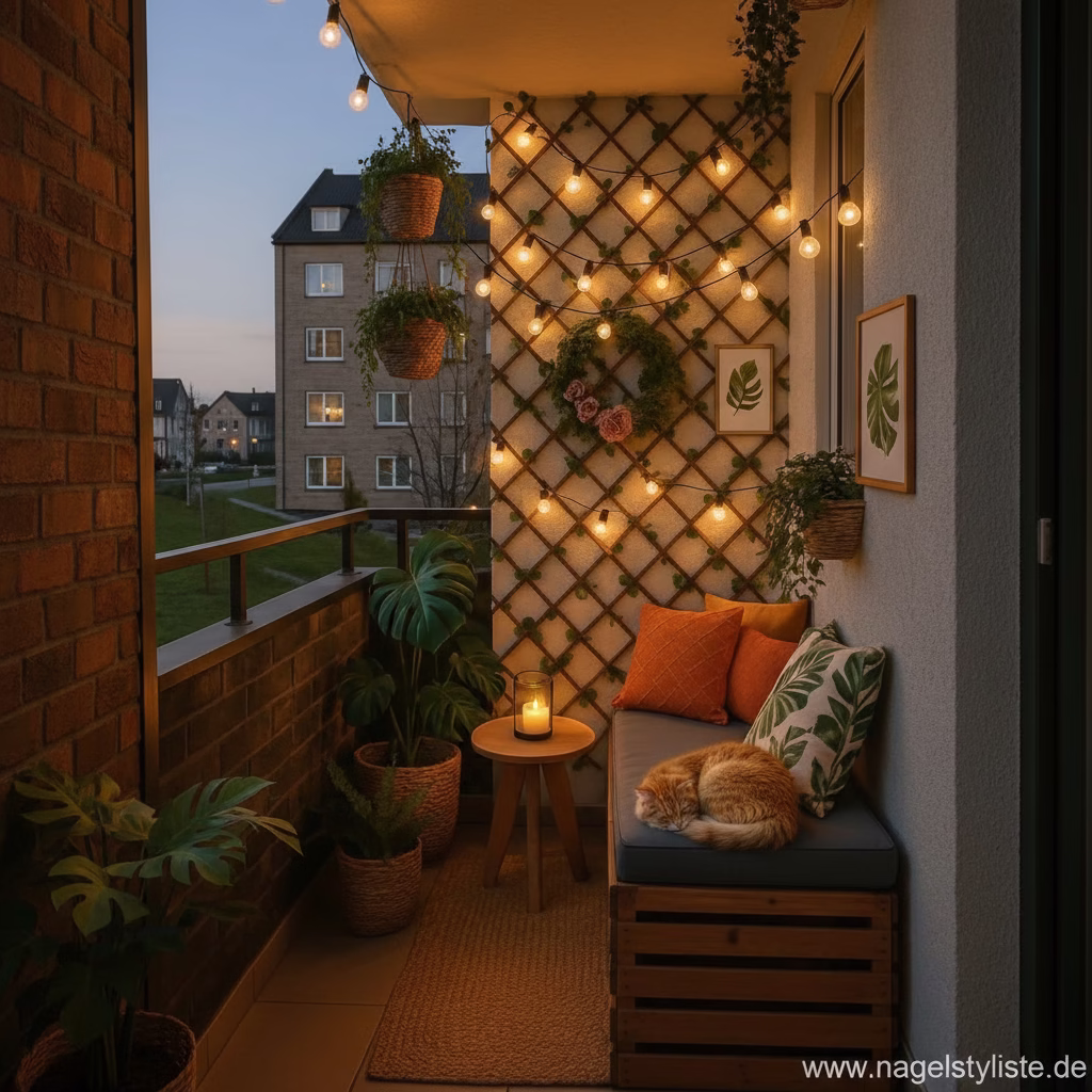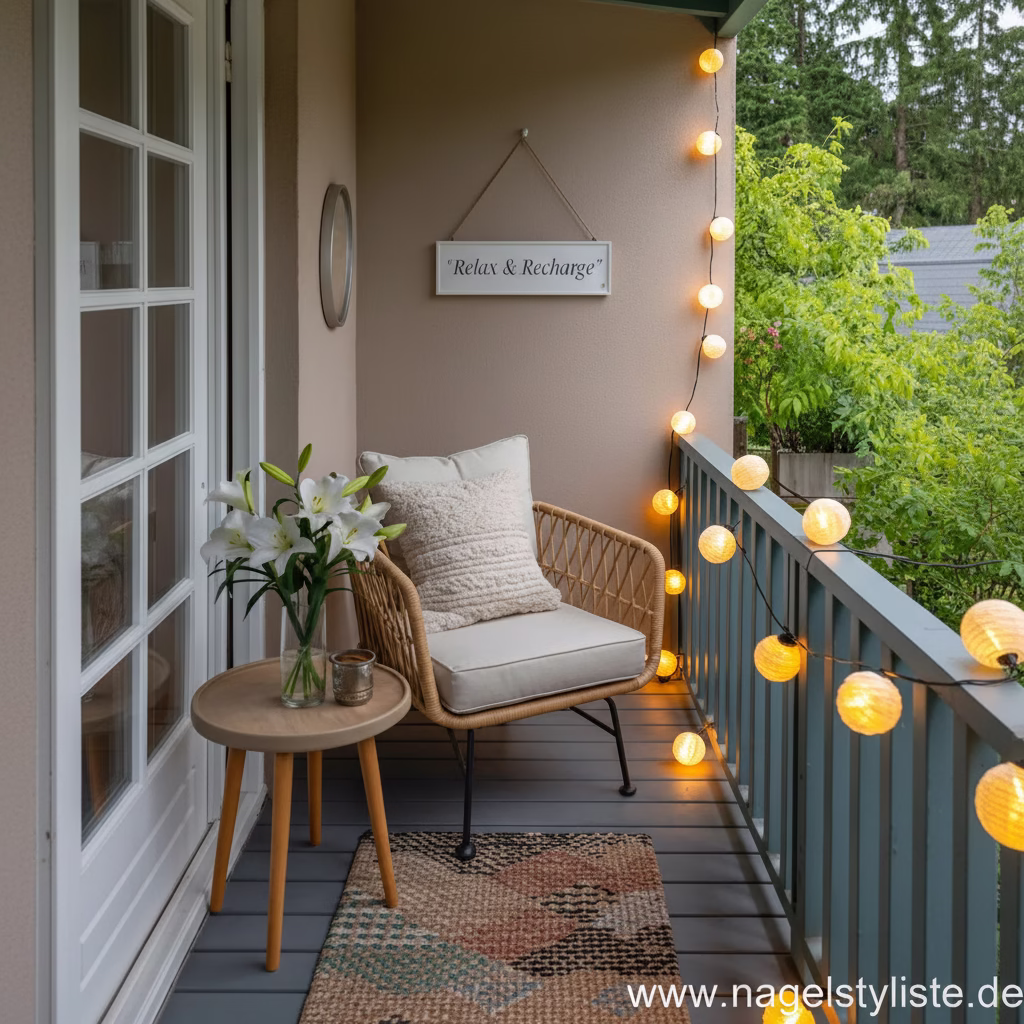 Die Beleuchtung beeinflusst maßgeblich die Atmosphäre eines Balkons. Auf kleinen Außenflächen empfehlen sich sanfte Lichtquellen, die ein warmes, ruhiges Ambiente schaffen. Lichterketten gehören dabei zu den beliebtesten Balkon Deko Ideen, da sie kaum Platz einnehmen und gleichzeitig ein romantisches Flair erzeugen.