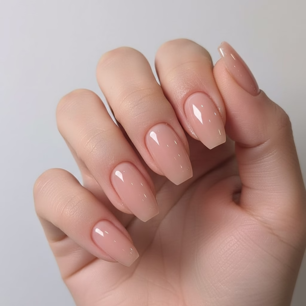 Auch in kurzer Länge bleibt die Ballerina-Form klar erkennbar. Die leicht zulaufenden Seiten und die gerade Spitze sorgen für eine elegante Linienführung. Die Finger wirken optisch länger, die Hände gepflegt und stilvoll.