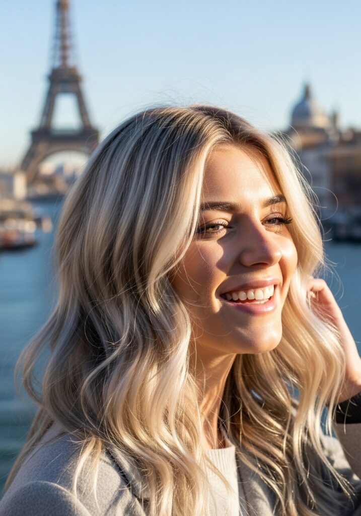 - Blaue Augen: Kühle Blondtöne wie Platin- oder Aschblond betonen die Klarheit blauer Augen.