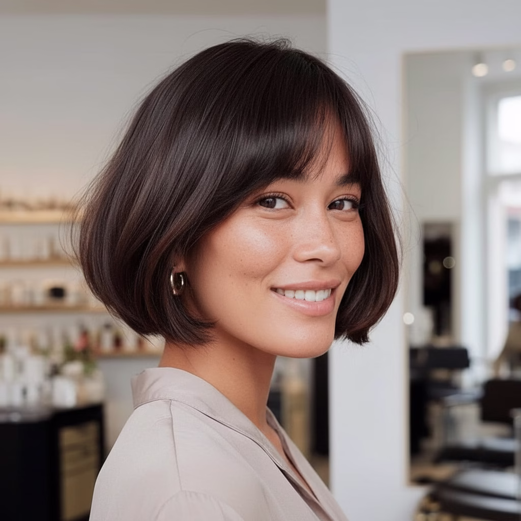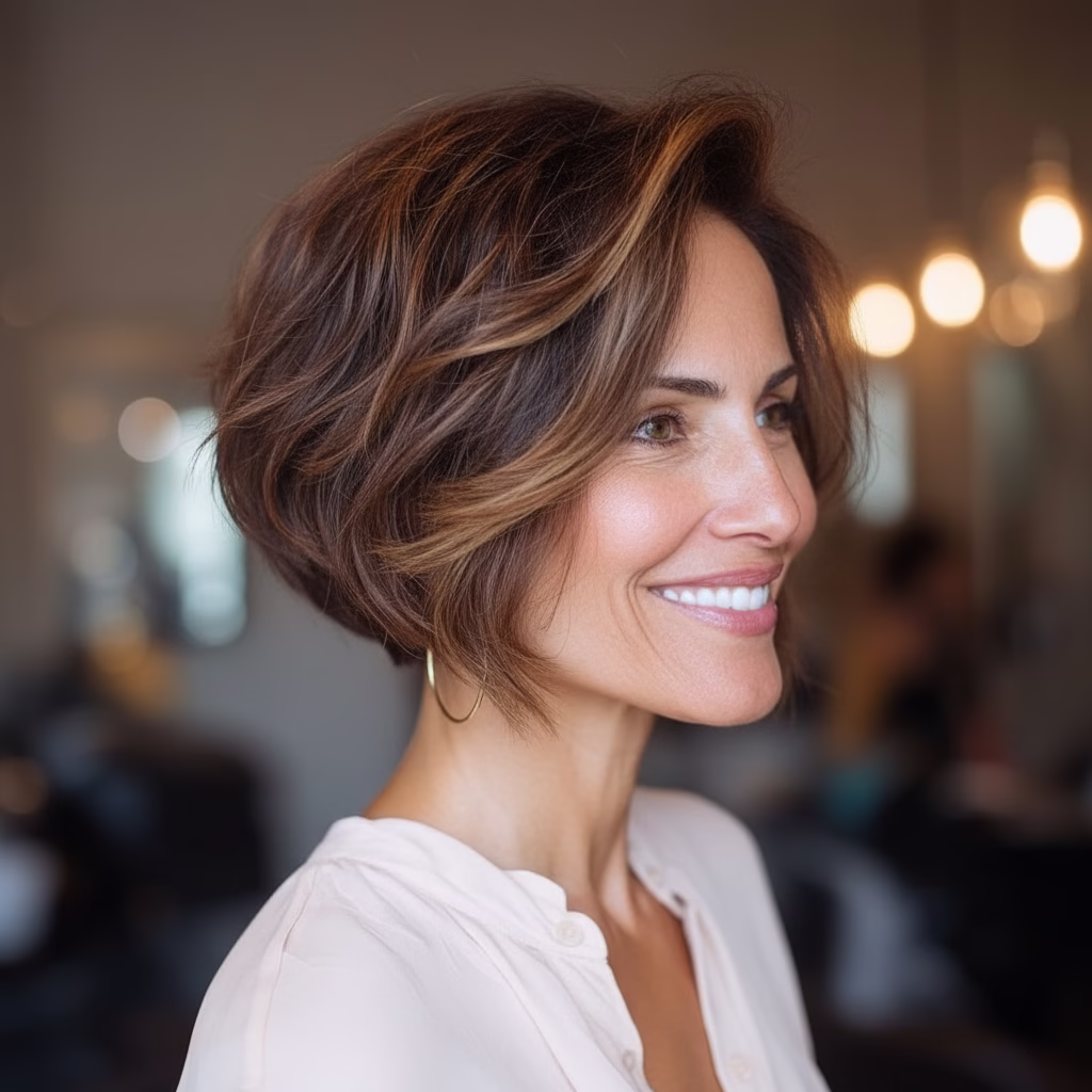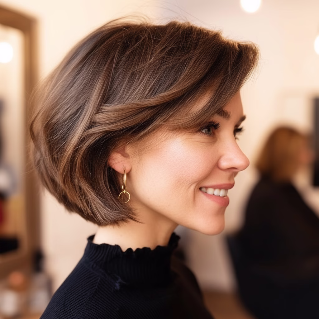 Viele Frauen schätzen an diesem Schnitt, dass er elegant wirkt, ohne streng zu sein. Die Stufen nehmen dem Bob seine Härte und verleihen ihm eine weiche, zugängliche Ausstrahlung.