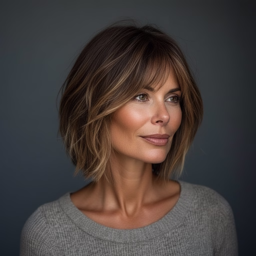 Ein Bob mit Pony kann Gesichtszüge harmonisieren und Akzente setzen. Die Kombination aus klarer Schnittführung und weichem Rahmen schafft Ausgewogenheit. Das Gesicht wirkt strukturiert, aber nicht hart.