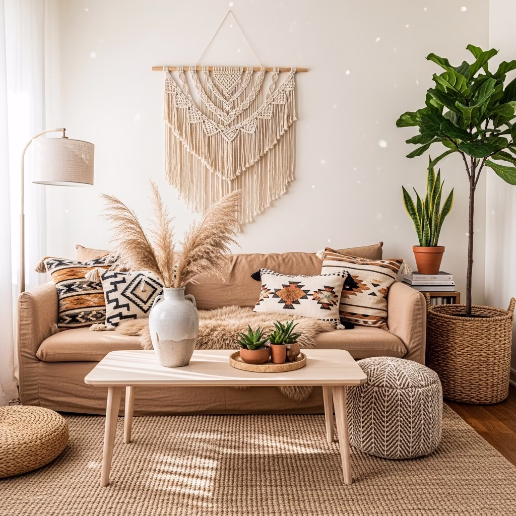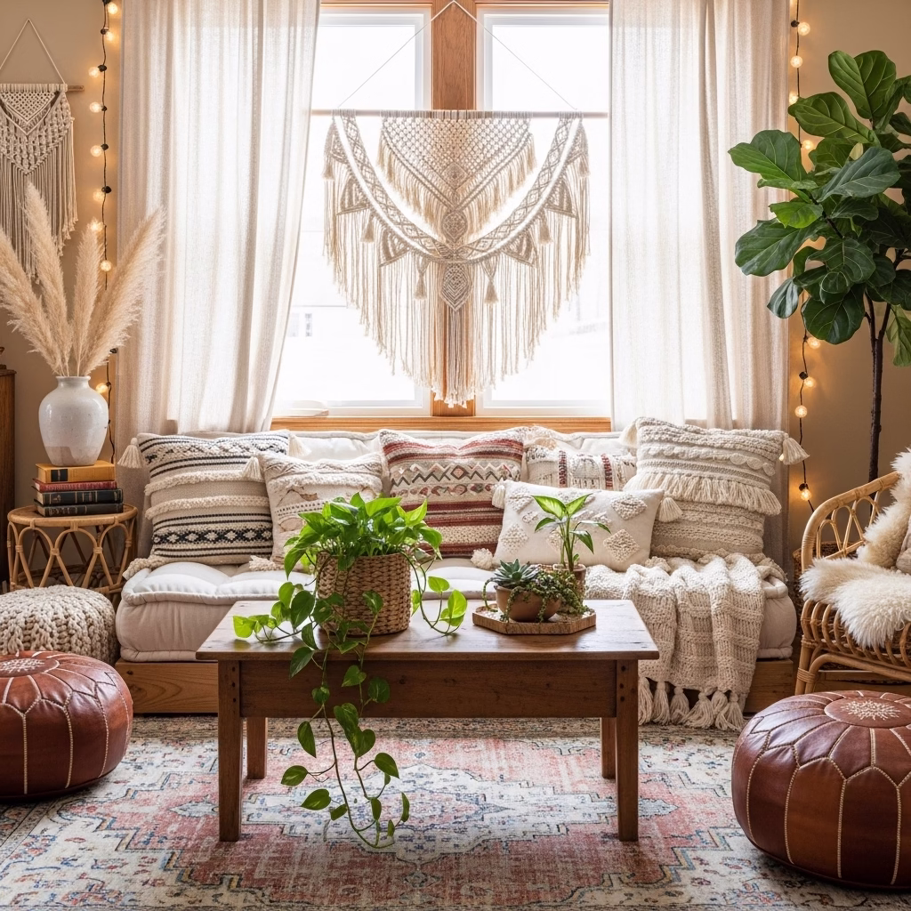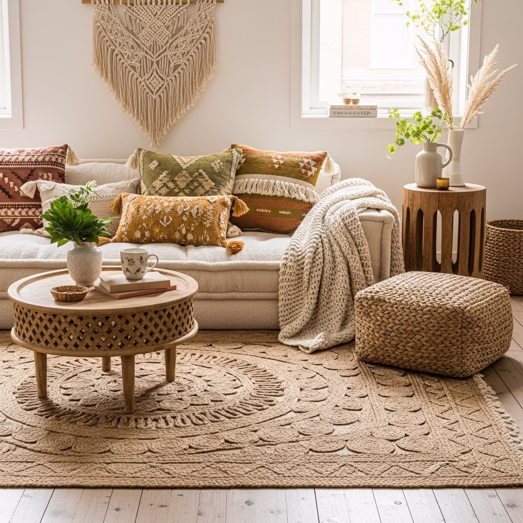 Textilien spielen im Boho Wohnzimmer eine besondere Rolle. Sie bringen Weichheit und Bewegung in den Raum. Durch ihre Präsenz entsteht ein Gefühl von Behaglichkeit und Wärme.