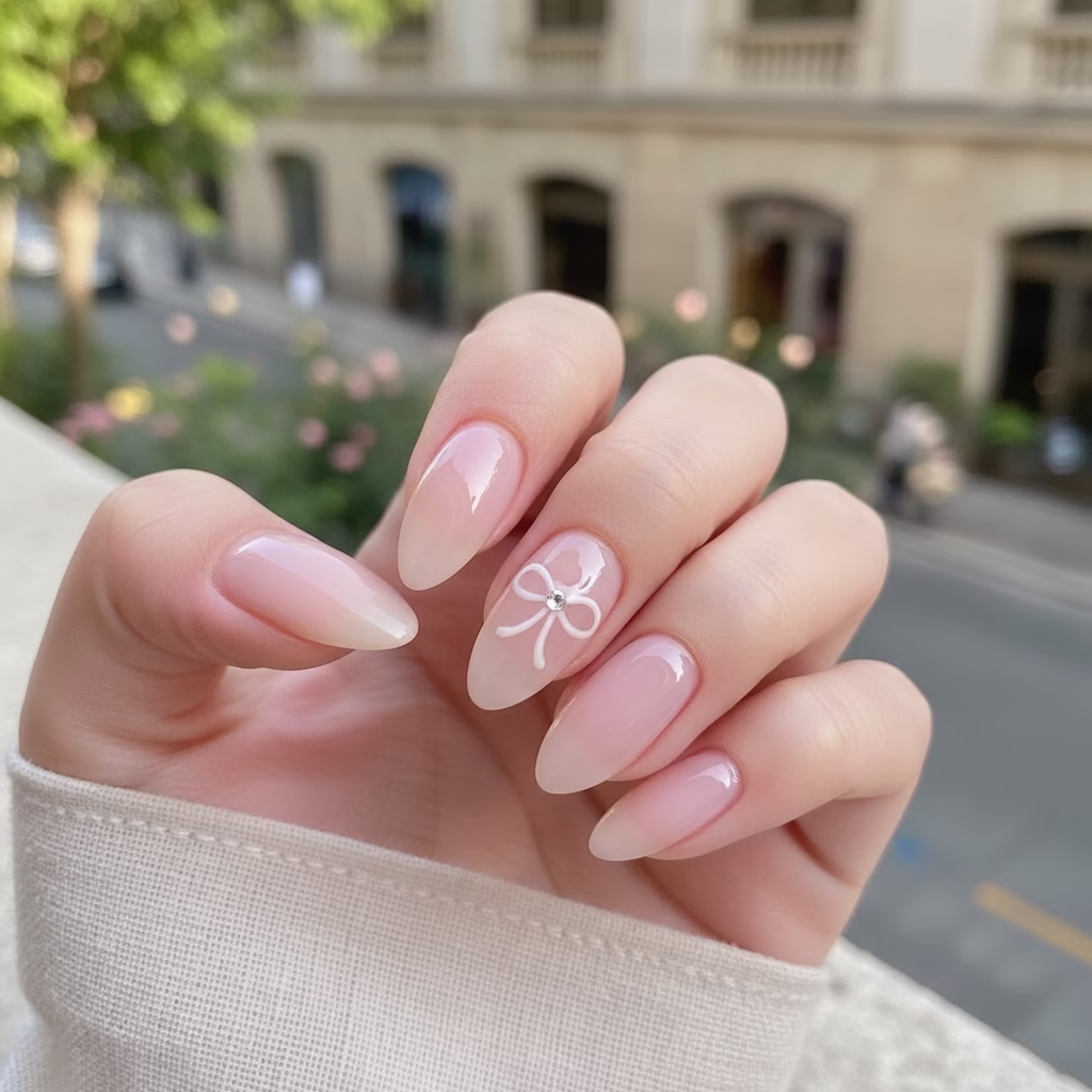 Die Bow Nails Maniküre bewegt sich stilistisch zwischen Romantik und moderner Klarheit. Die Schleife bringt Weichheit, während das Gesamtbild ruhig und geordnet bleibt.
