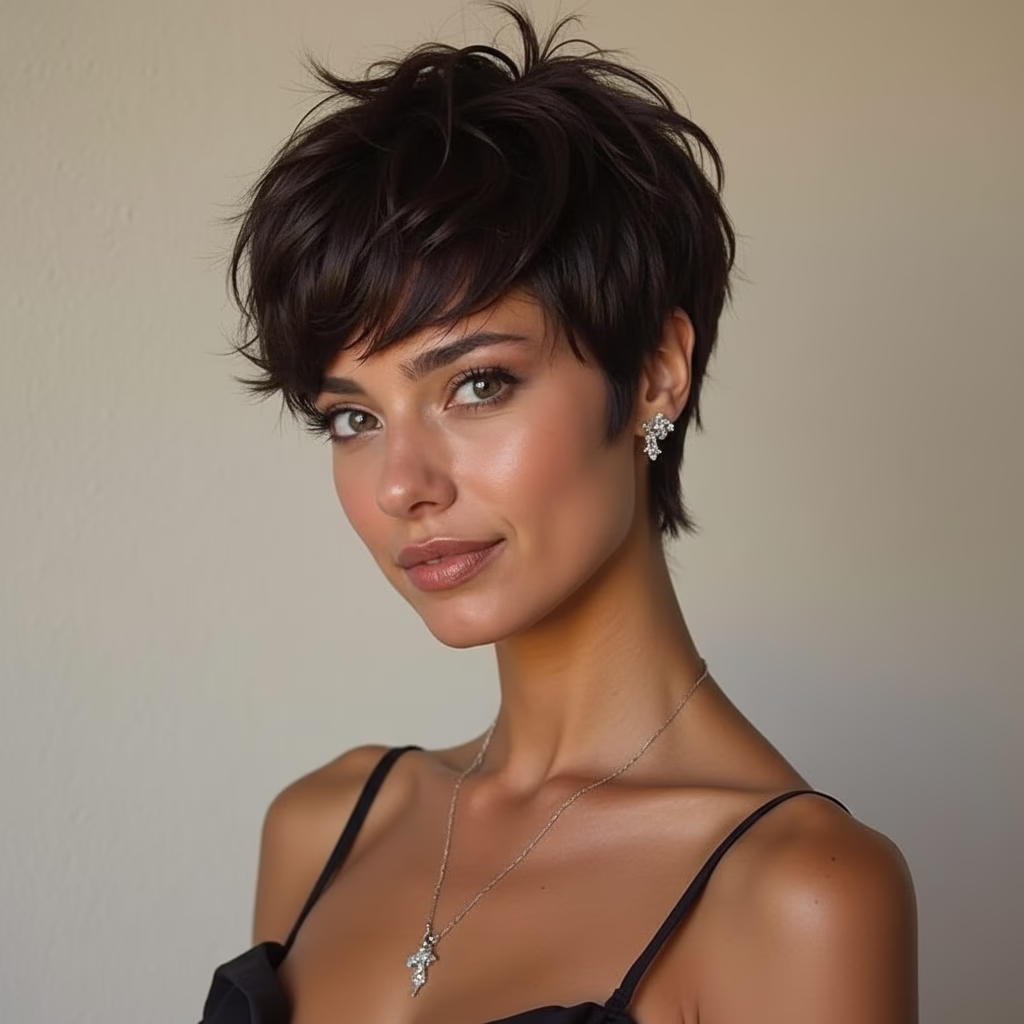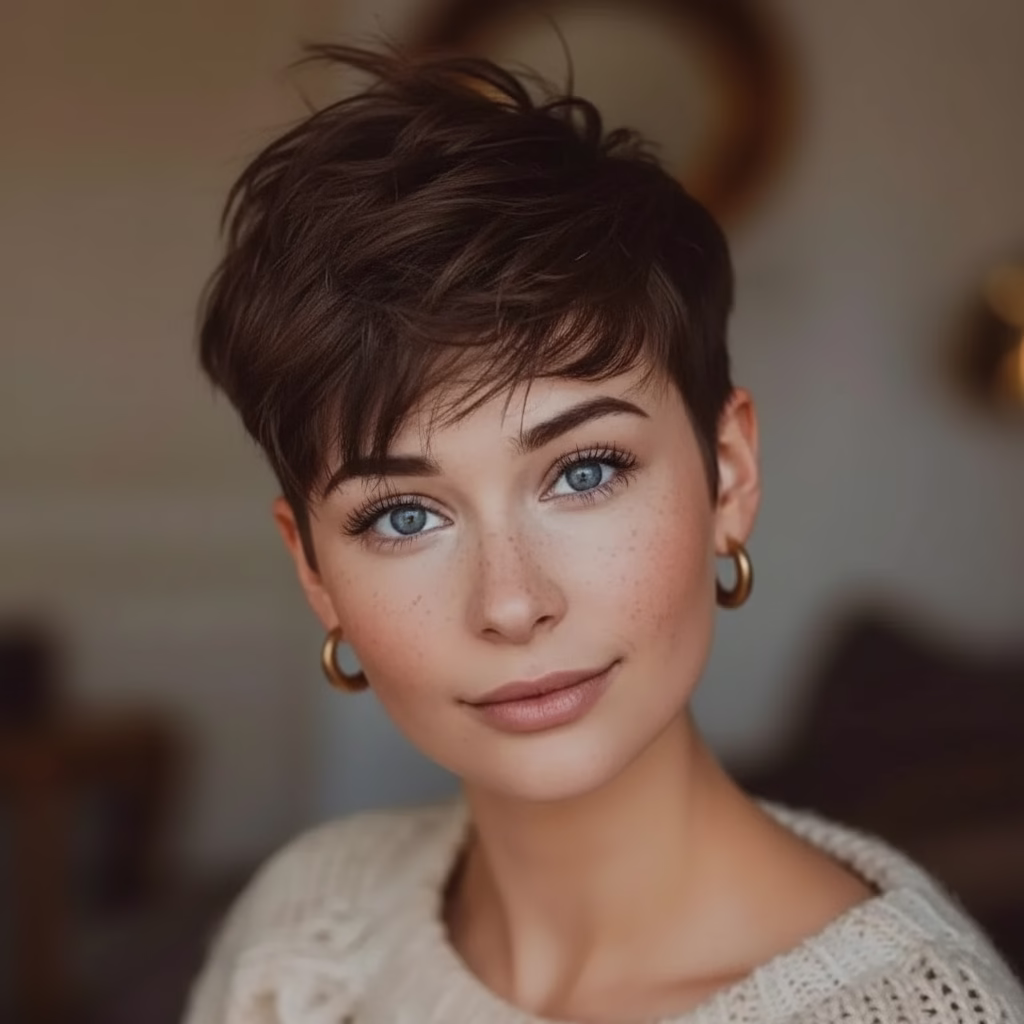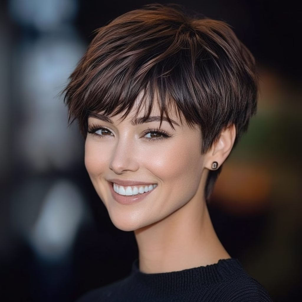Die Kombination aus Braun, Kurzhaarschnitt und Pony sorgt für einen Look, der bewusst gewählt wirkt, ohne überladen zu sein.