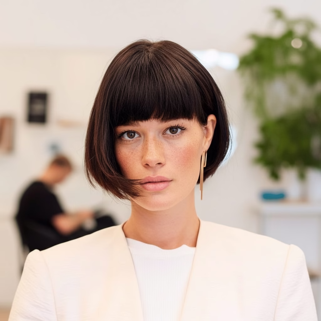 Braun ist eine der vielseitigsten Haarfarben überhaupt. In Kombination mit einem Kurzhaarschnitt wirkt sie besonders harmonisch und hochwertig. Der Pony ergänzt diesen Look perfekt, da er die Aufmerksamkeit auf Augen und Gesichtszüge lenkt.