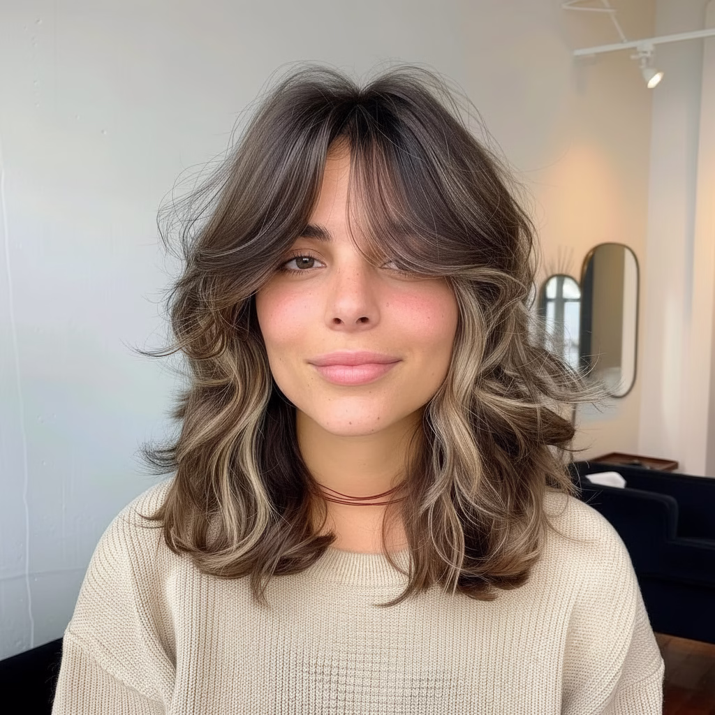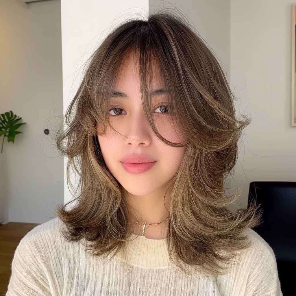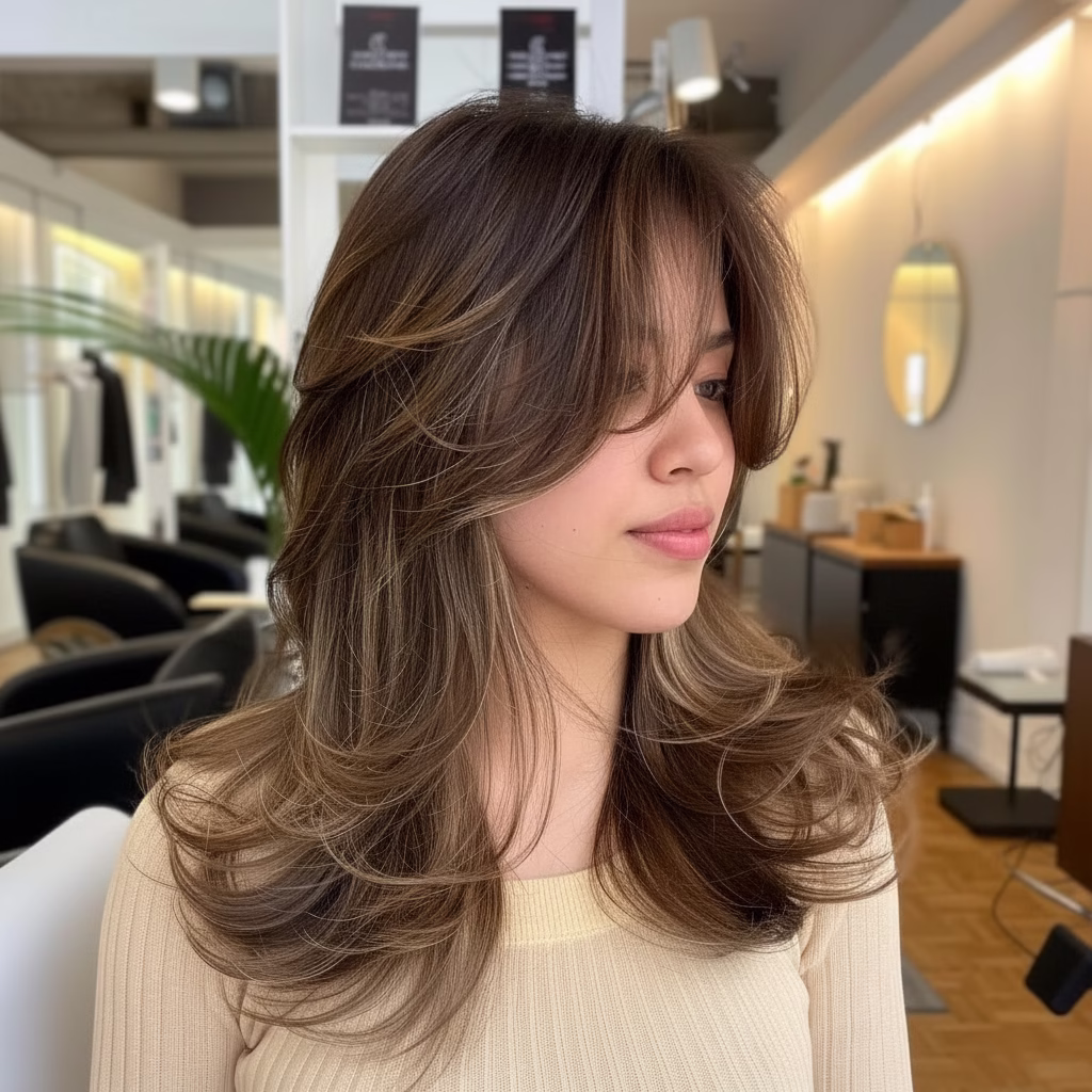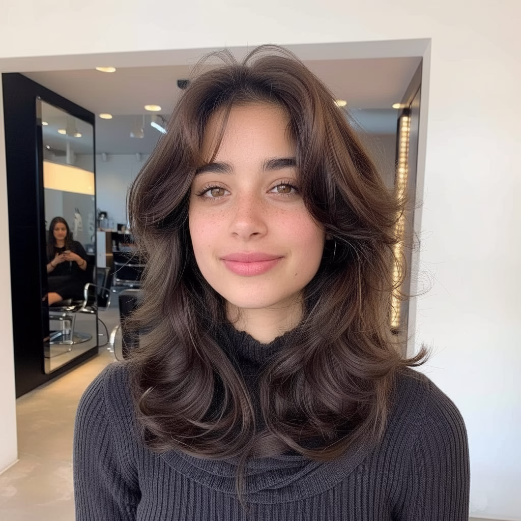 Ein zentrales Element des Butterfly Haircuts ist das Face Framing. Die kürzeren Partien rund um das Gesicht rahmen die Gesichtszüge sanft ein und lenken den Blick auf Augen, Wangenknochen und Lippen.