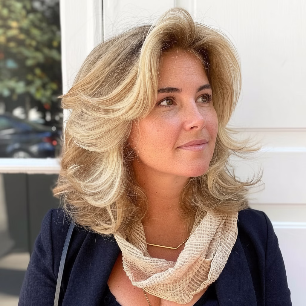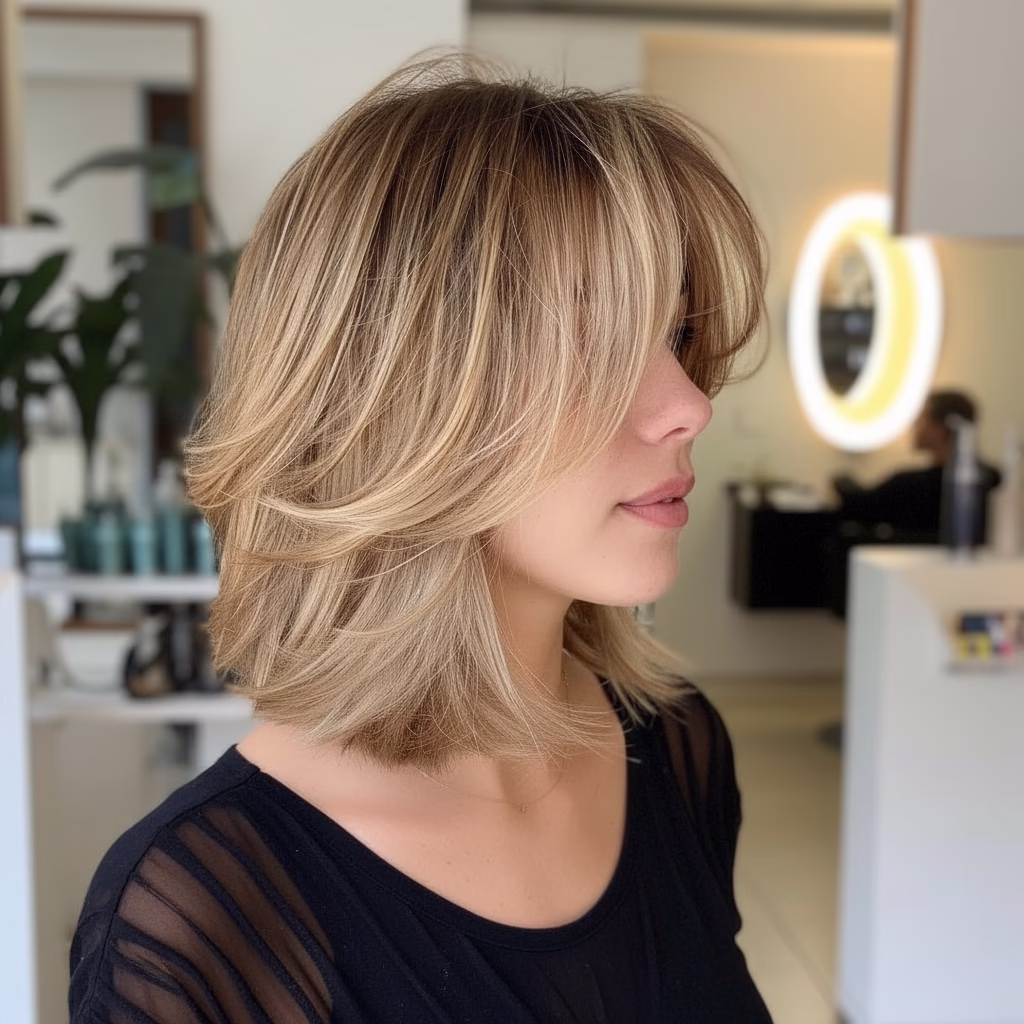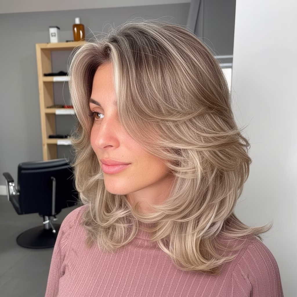 Frauen mit feinem Haar profitieren besonders stark von diesem Schnitt. Die gezielt gesetzten Stufen erzeugen optische Fülle und lassen das Haar dichter wirken.