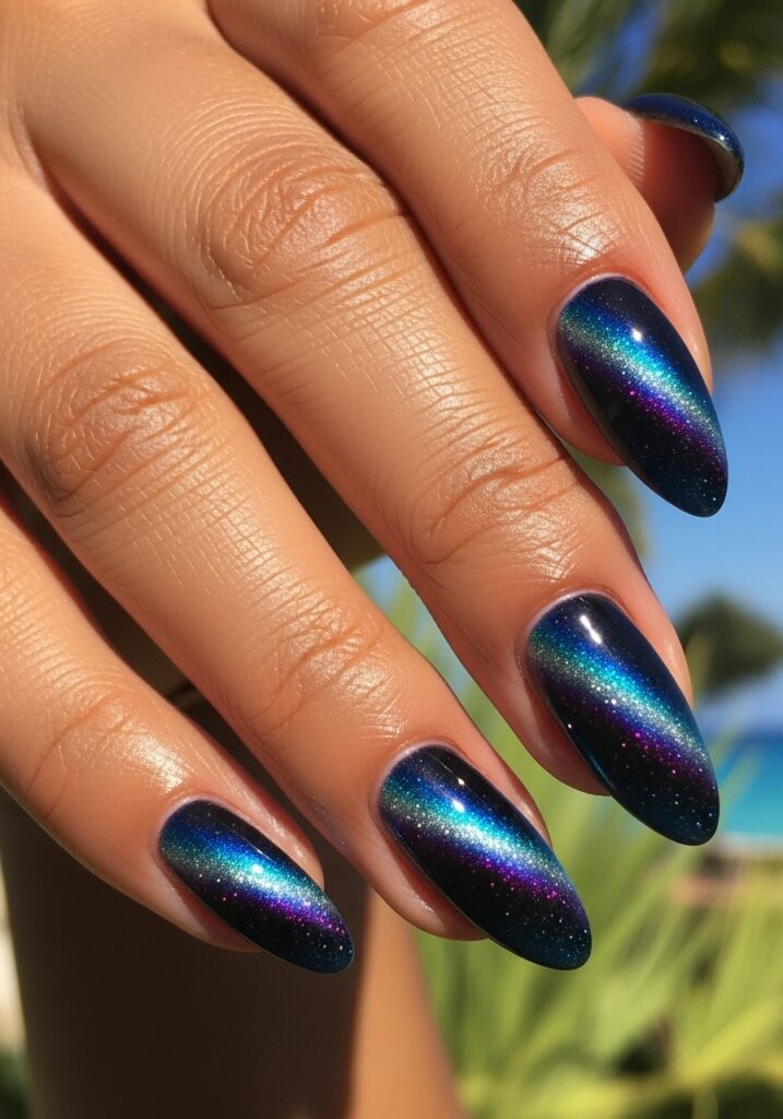 Wechselt je nach Licht von Lila zu Grün oder von Gold zu Bronze – dieser Look lässt die Cat Eye Nägel wie flüssiges Metall wirken. 🌈