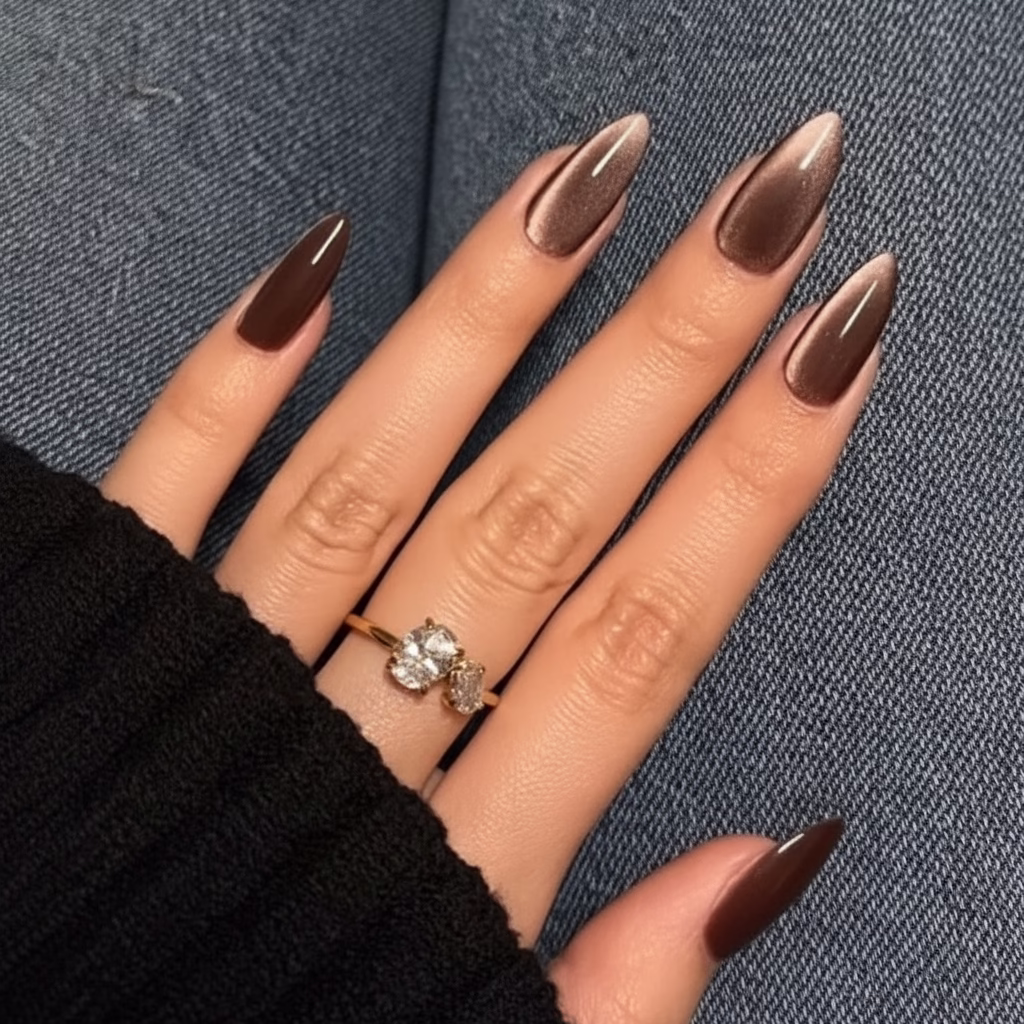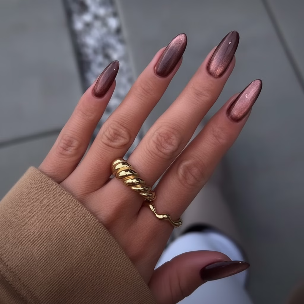 Cat Eye Nägel in Braun fügen sich harmonisch in das Gesamtbild ein. Sie wirken ausgleichend und verleihen den Händen eine gepflegte, elegante Ausstrahlung. Der sanfte Schimmer zieht Aufmerksamkeit auf sich, ohne dominant zu sein.
