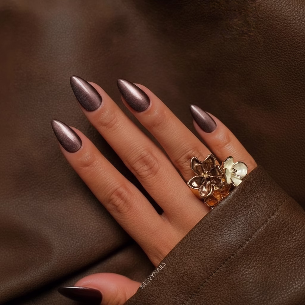 Der schimmernde Lichtreflex verleiht der Farbe Bewegung. Je nach Lichteinfall changiert Braun zwischen weich, geheimnisvoll und intensiv – ein Effekt, der den Nägeln Charakter verleiht, ohne aufdringlich zu sein.