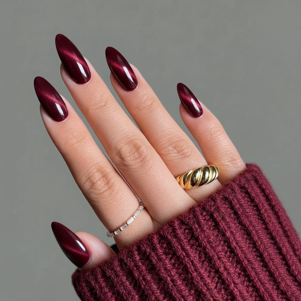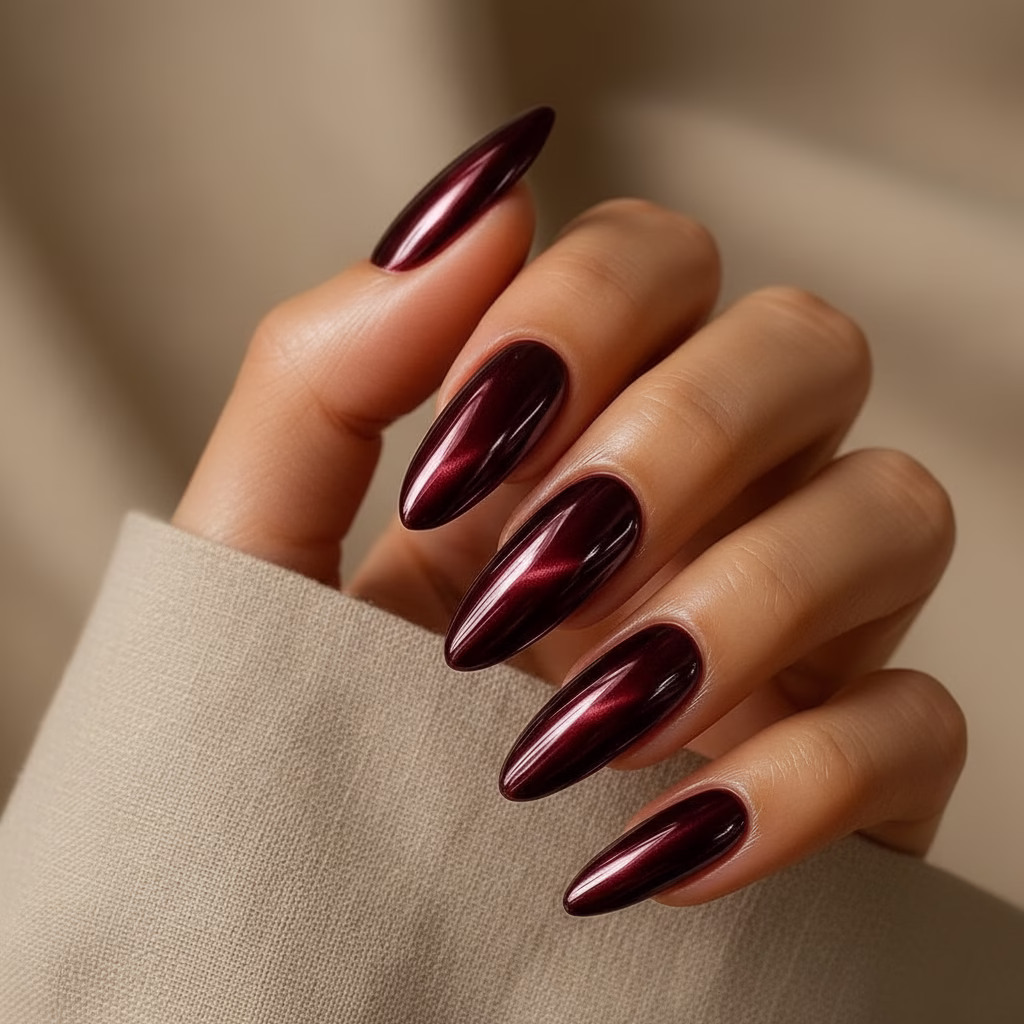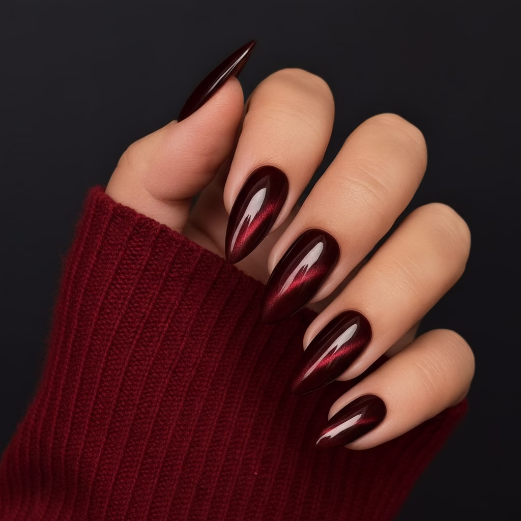 Trotz ihrer Intensität wirken Cat Eye Nägel Rot nie übertrieben. Der schimmernde Effekt ist gezielt eingesetzt und bleibt kontrolliert. Dadurch behalten die Nägel ihre Eleganz, selbst bei kräftiger Farbwirkung.