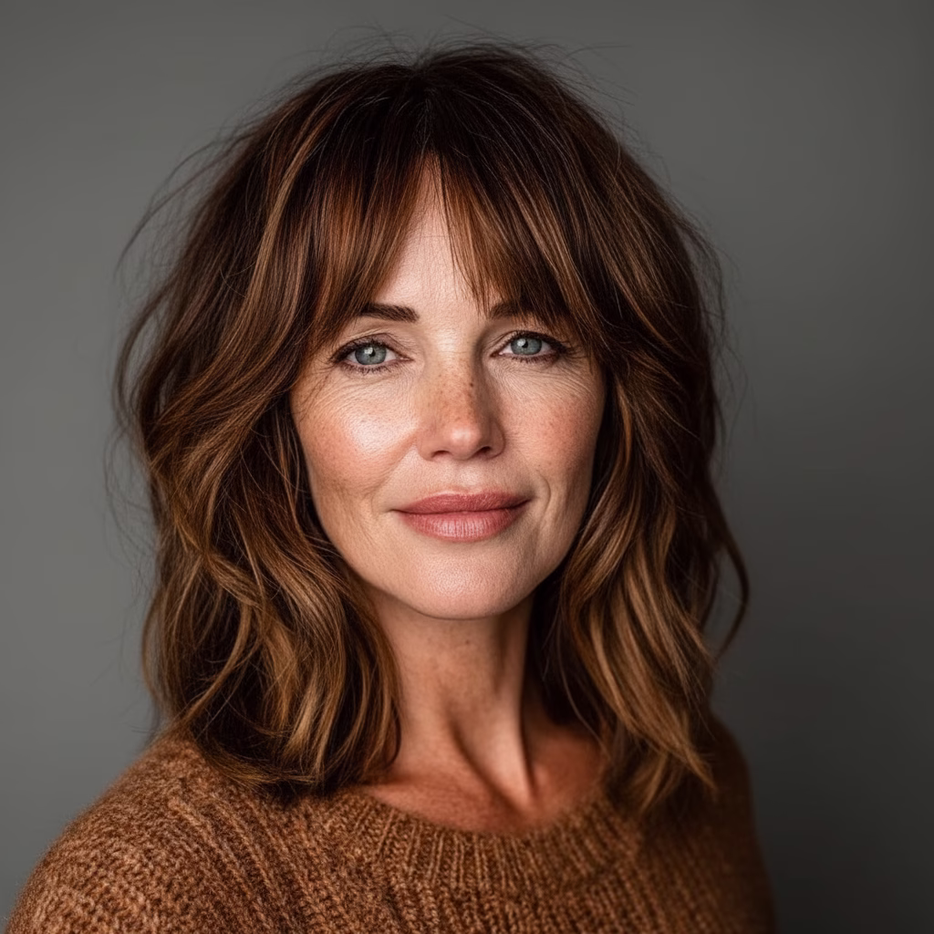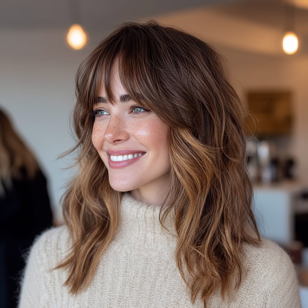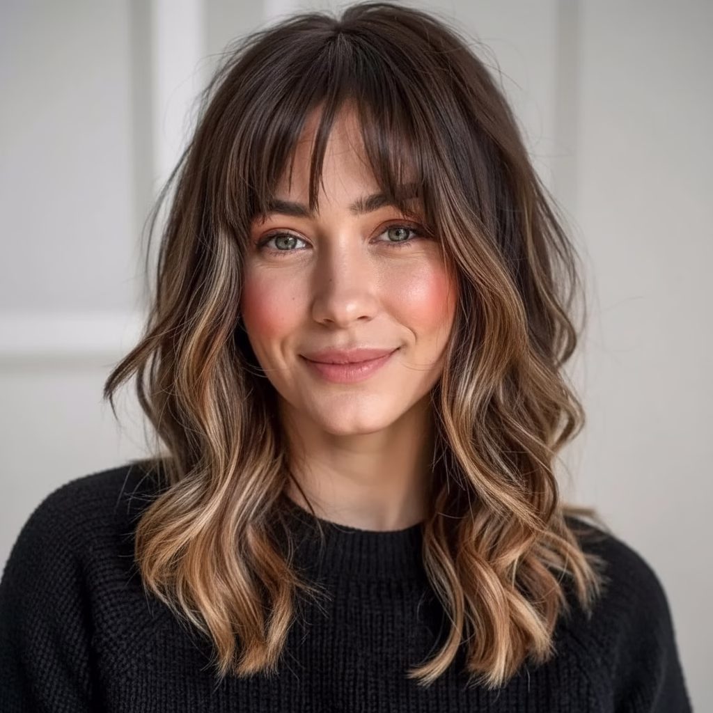 Weil mittellanges Haar ideale Voraussetzungen für weiche Übergänge bietet und Curtain Bangs hier besonders ausgewogen wirken.