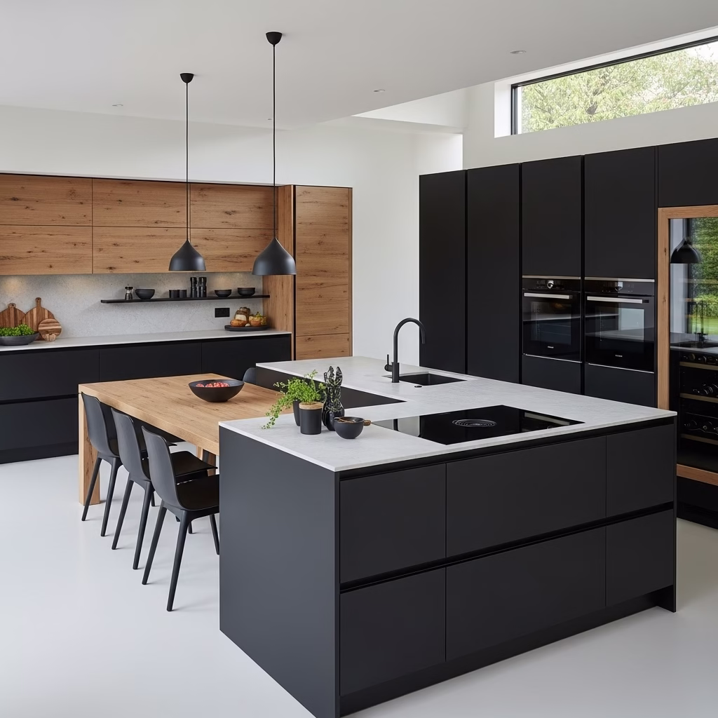 In modernen Wohnkonzepten fügt sich eine schwarze Designküche nahtlos in offene Grundrisse ein. Sie wirkt wie ein architektonisches Element, das den Raum gliedert und ihm Struktur verleiht. Besonders in offenen Wohnküchen wird Schwarz gezielt eingesetzt, um Zonen zu definieren und visuelle Ruhe zu schaffen.