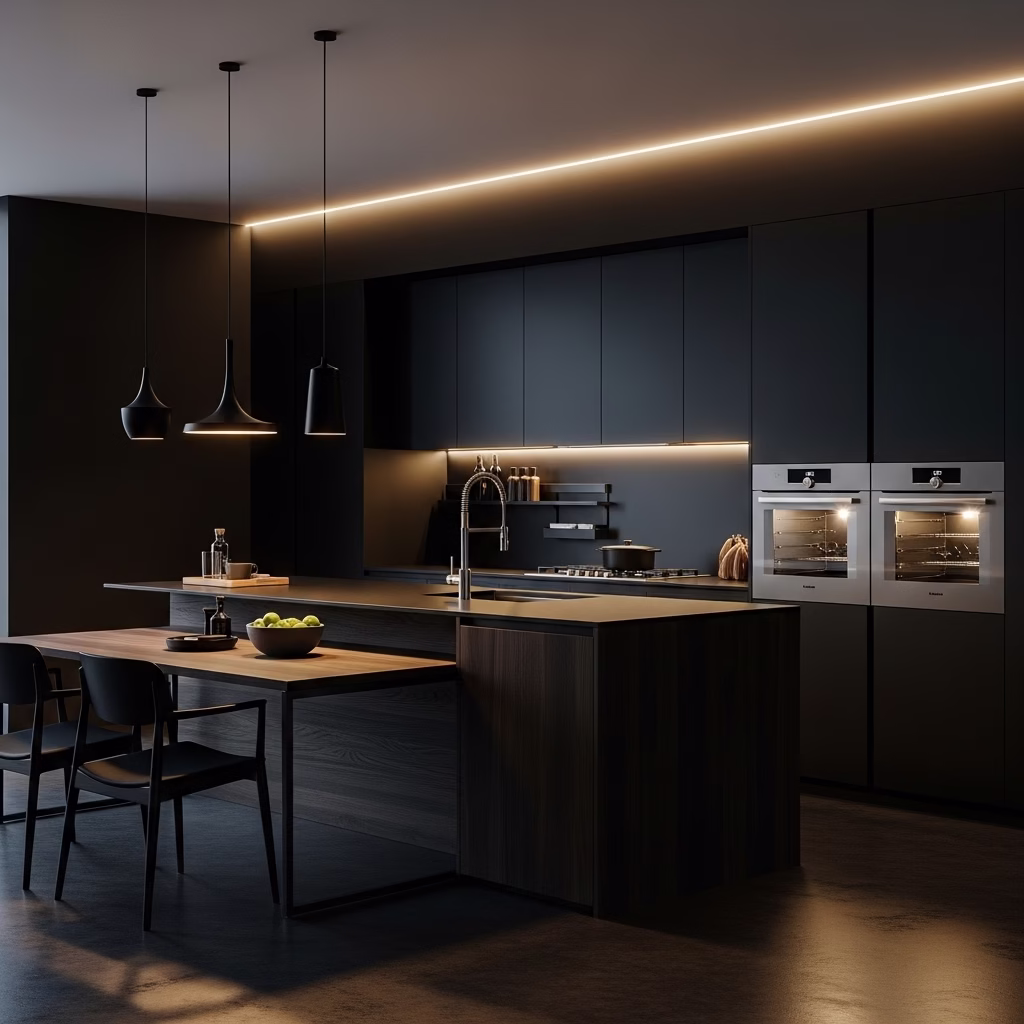 In einer schwarzen Küche übernimmt Licht eine besondere Rolle. Es modelliert den Raum, hebt Strukturen hervor und sorgt für Balance. Durch gezielte Lichtakzente entsteht eine lebendige Dynamik, die die dunkle Farbwelt auflockert.