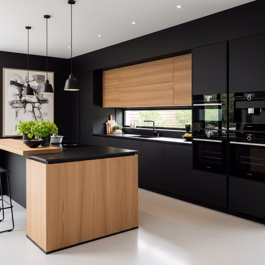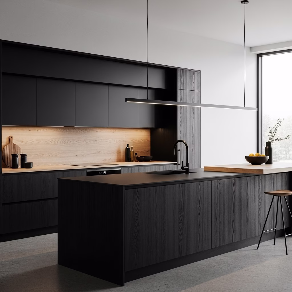 Schwarz lebt von Kontrasten. In der Küchengestaltung entsteht Spannung durch das Zusammenspiel von dunklen Flächen und gezielt eingesetzten hellen oder natürlichen Elementen. Diese Kontraste verleihen dem Raum Tiefe und verhindern Monotonie.