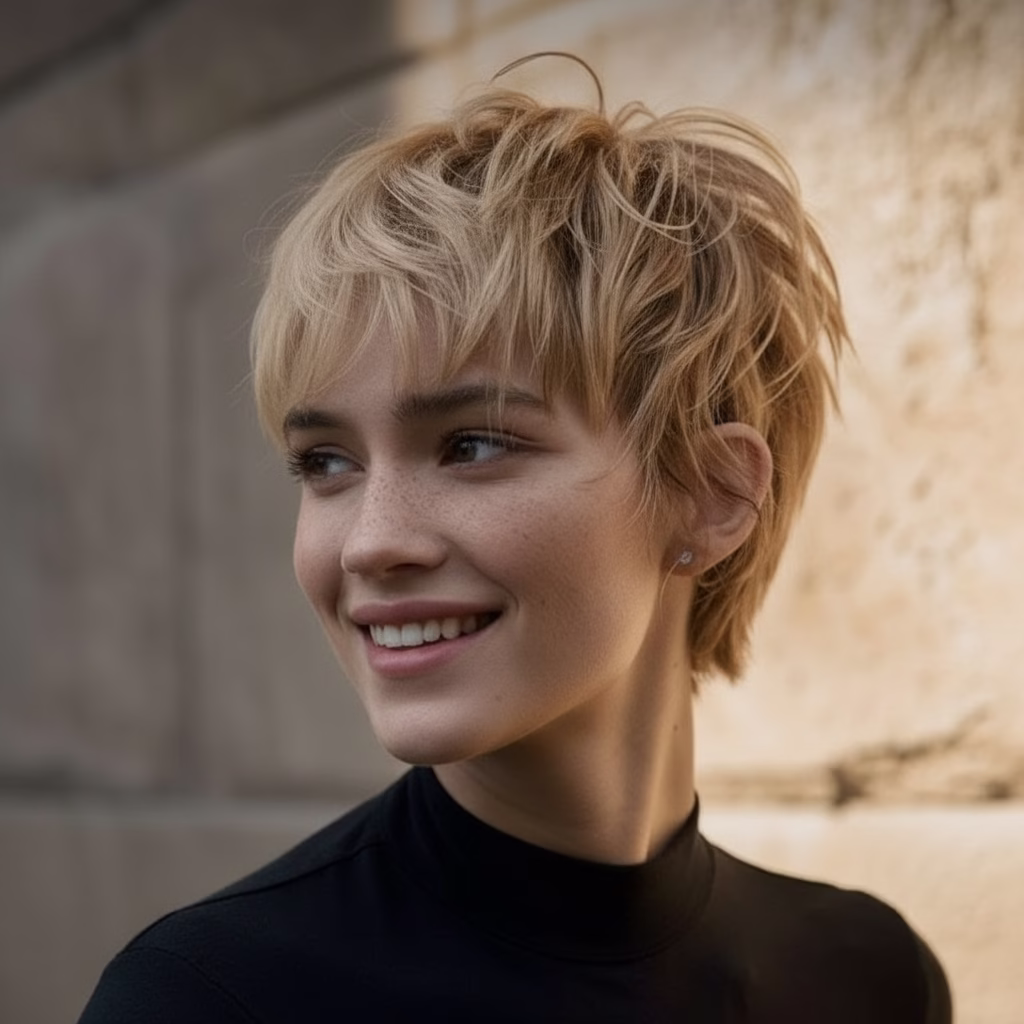 Ein fransiger Kurzhaarschnitt vermittelt Leichtigkeit – nicht nur optisch, sondern auch im Ausdruck. Er wirkt unangestrengt und selbstverständlich, ohne an Wirkung zu verlieren.