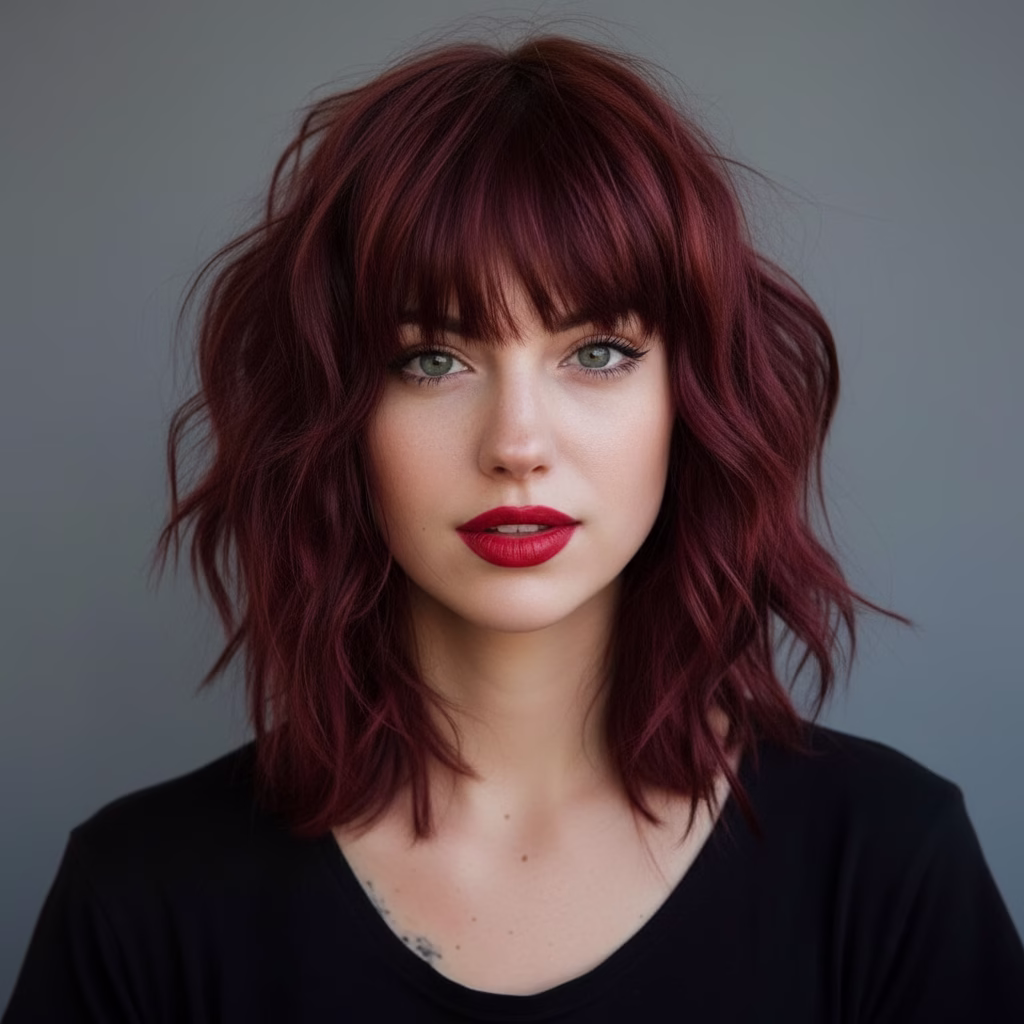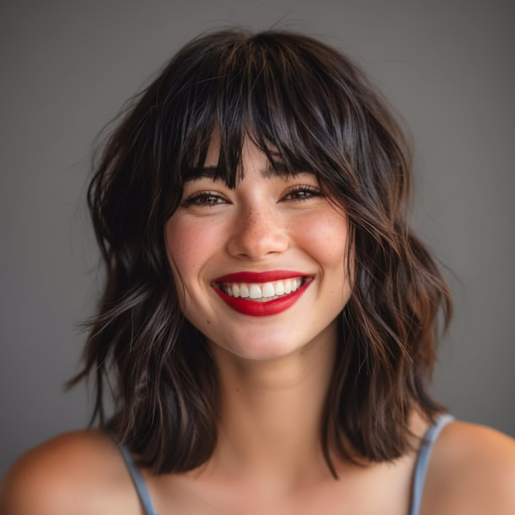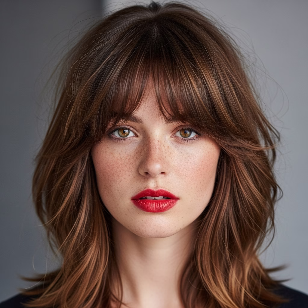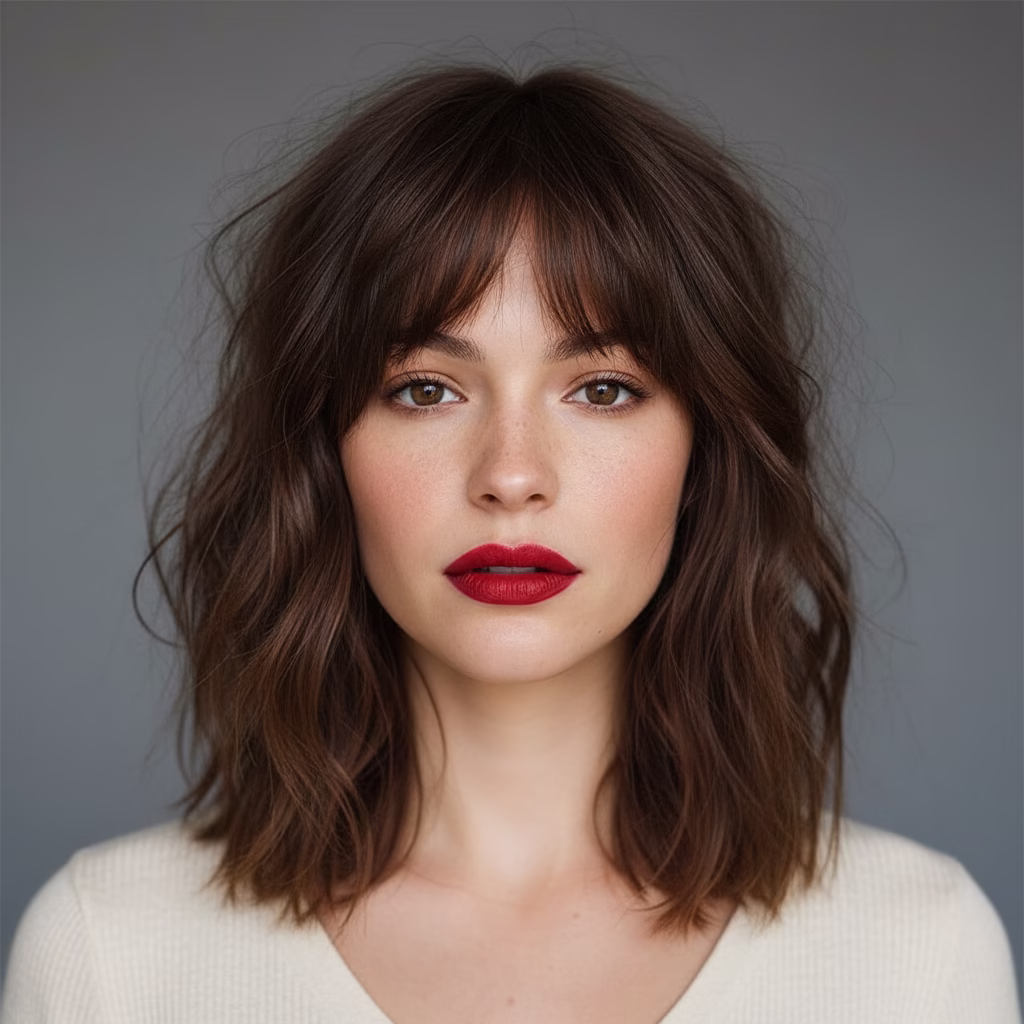 Der Look ist weder laut noch zurückhaltend – er ist klar. Er steht für Individualität, moderne Weiblichkeit und bewusste Ästhetik. Fransige Frisuren mittellang mit Pony setzen ein Zeichen für Stil mit Substanz.