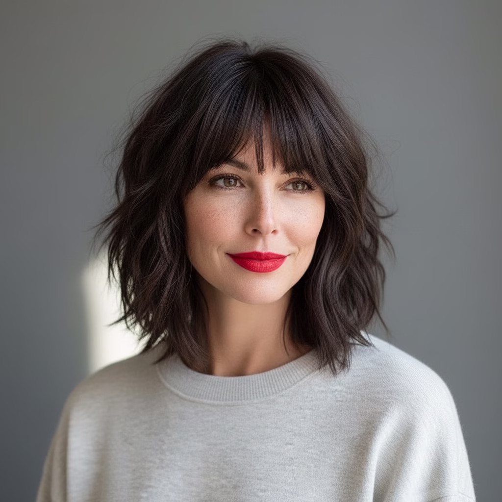 Fransige Frisuren in mittlerer Länge mit Pony zählen zu den ausdrucksstärksten Haarschnitten für Frauen, die sich eine harmonische Verbindung aus Bewegung, Eleganz und Natürlichkeit wünschen. Sie wirken weder streng noch beliebig, sondern vereinen Struktur und Weichheit auf besonders ausgewogene Weise. Der Pony ergänzt die fransigen Längen und verleiht dem Look eine klare, aber sanfte Kontur.