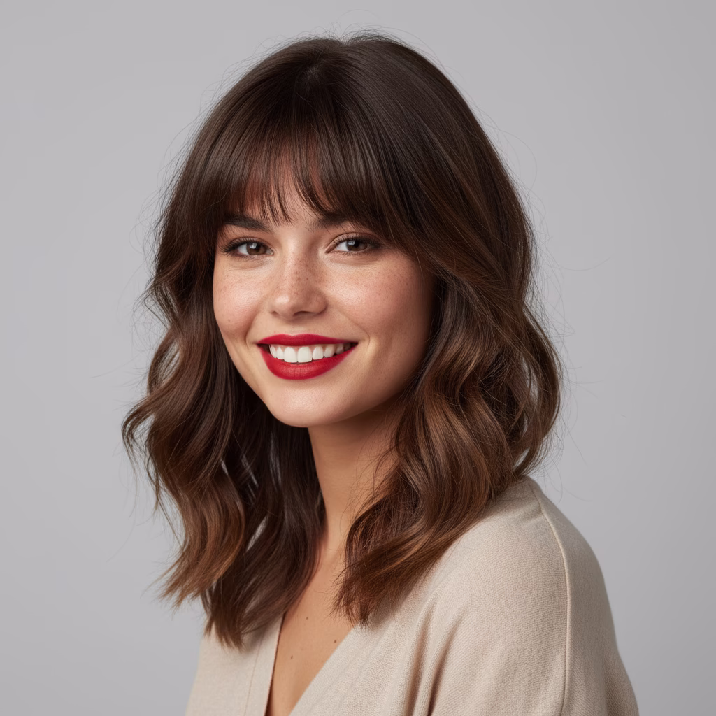 Im Zusammenspiel mit einem Pony entsteht ein Look, der Tiefe und Leichtigkeit zugleich vermittelt. Das Haar fällt natürlich, fast mühelos, und wirkt dennoch durchdacht.