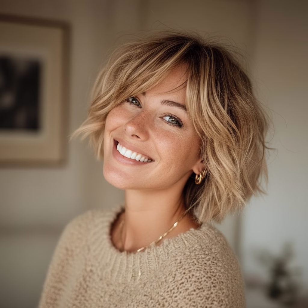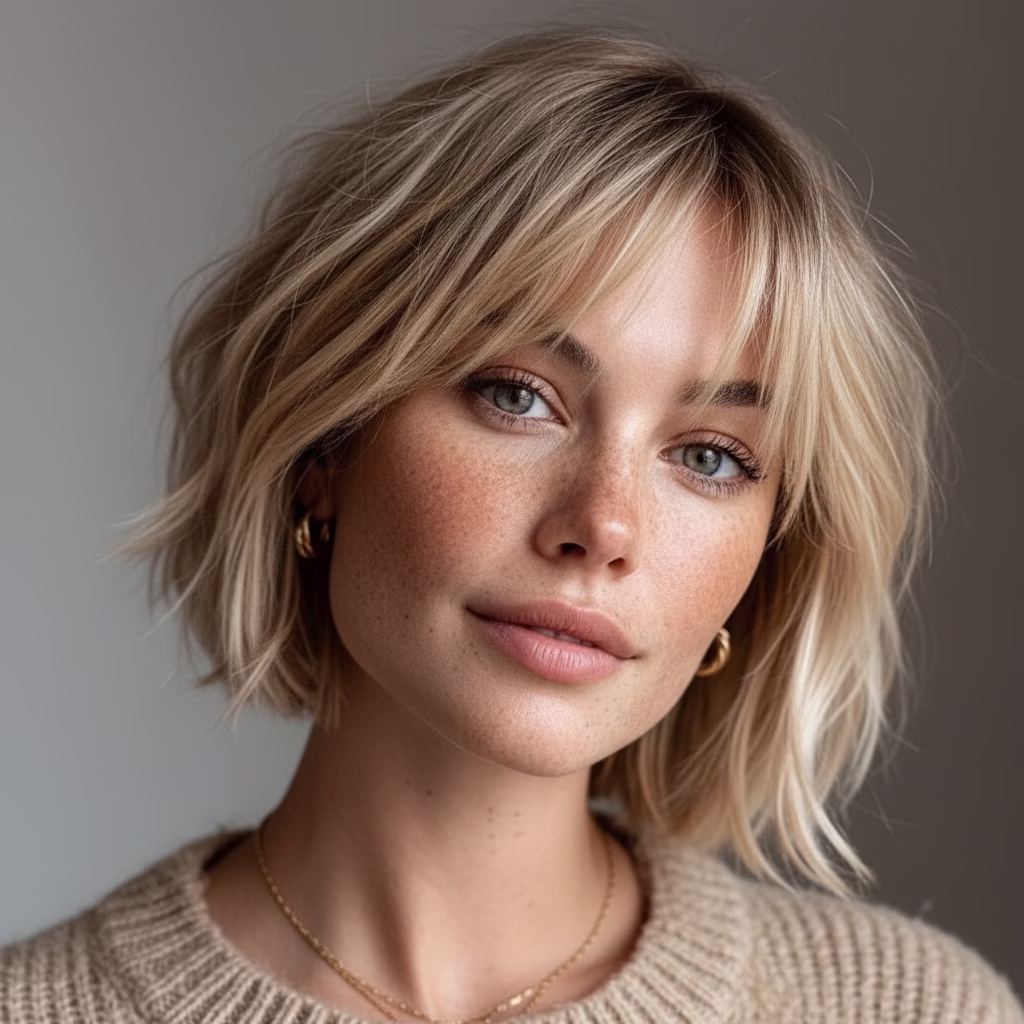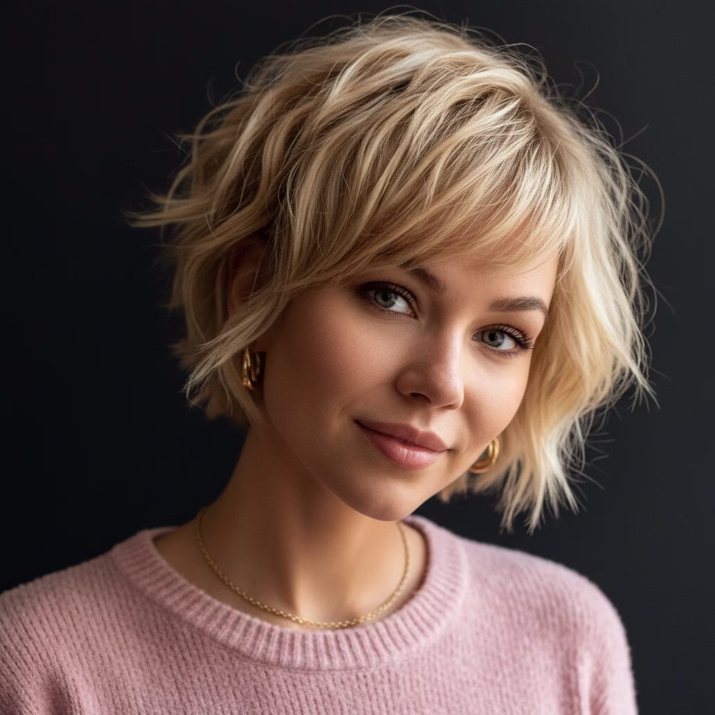 Ein fransiger Pony bei kurzen Haaren ist präsent, ohne aufdringlich zu sein. Er zieht den Blick an, ohne das Gesicht zu verdecken.