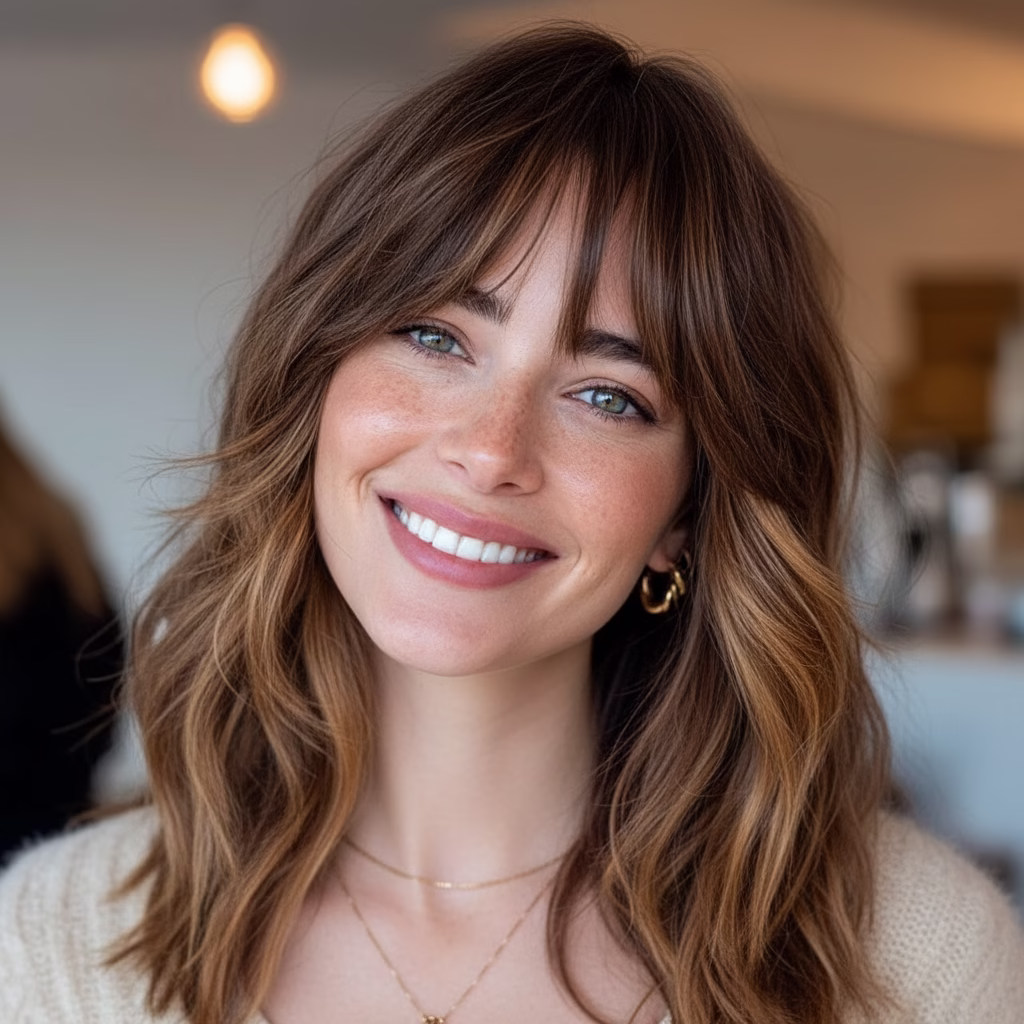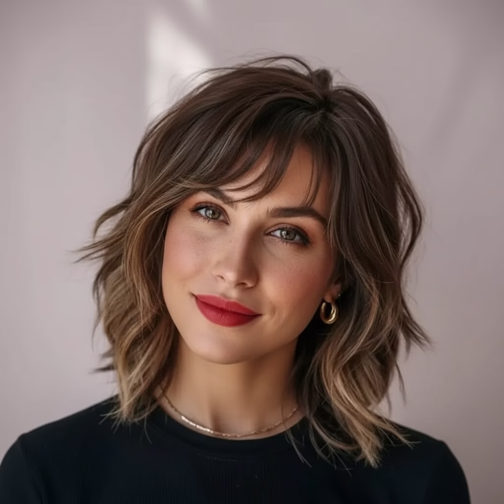 Die Kombination aus fransigem Pony und mittellangen Haaren wirkt feminin, ohne verspielt zu sein. Die Leichtigkeit des Ponys verleiht dem Look eine moderne, erwachsene Note.