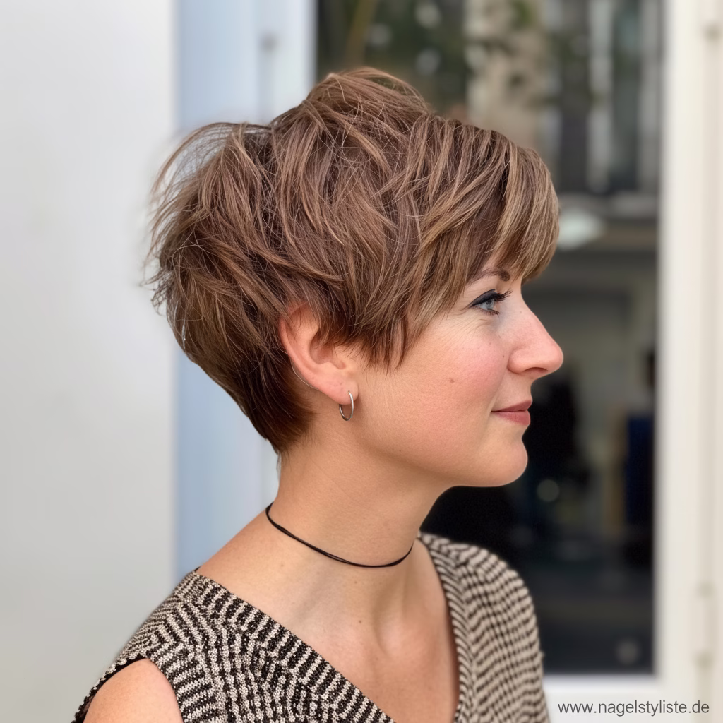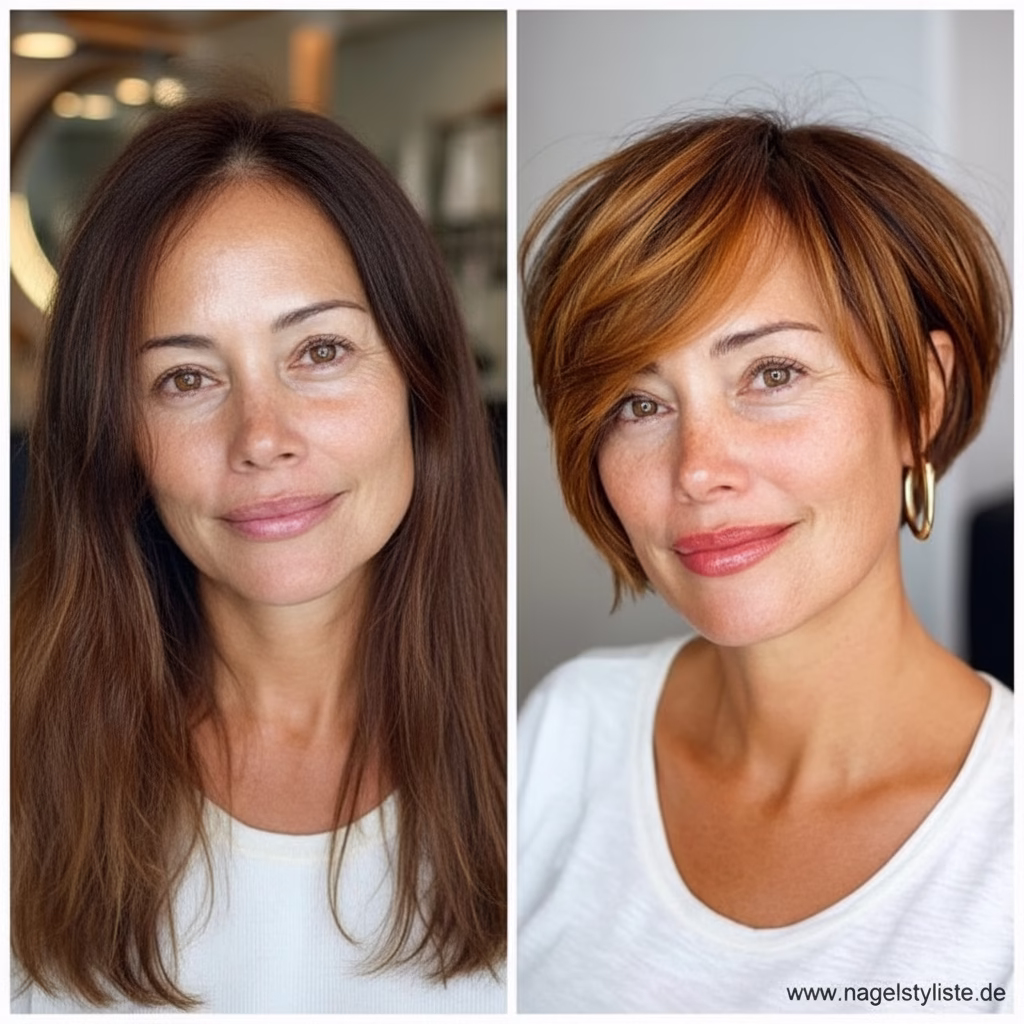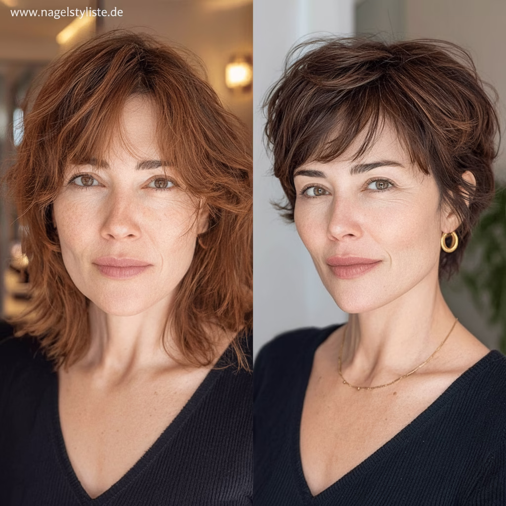Mutige Frauen setzen auf kräftige Trendfarben wie Kupfer, Rotbraun oder Caramel Highlights. Diese intensiven Nuancen bringen Tiefe und Leidenschaft in den Look und lassen die kurzen Strukturen noch ausdrucksstärker erscheinen. Besonders fransige und stufige Schnitte profitieren von solchen Farbakzenten, da sie das Spiel von Licht und Schatten besonders intensiv zeigen.