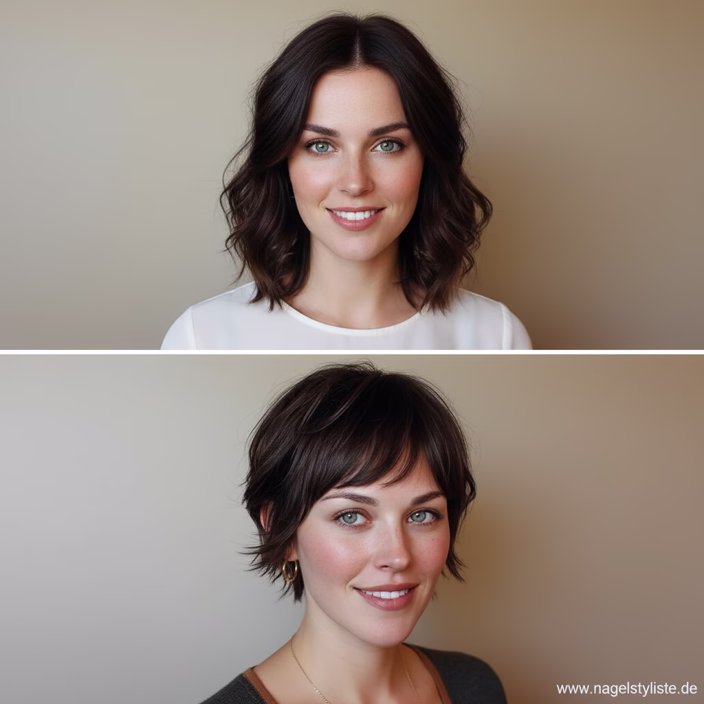 Bei runden Gesichtsformen empfiehlt sich ein Schnitt mit klaren Linien und etwas Volumen am Deckhaar, um das Gesicht optisch zu strecken. Asymmetrische Seiten und leichte Fransen sorgen dafür, dass die Konturen schmaler wirken. Ein frecher Pixie oder ein Short Bob mit seitlichem Akzent ist hier ideal.