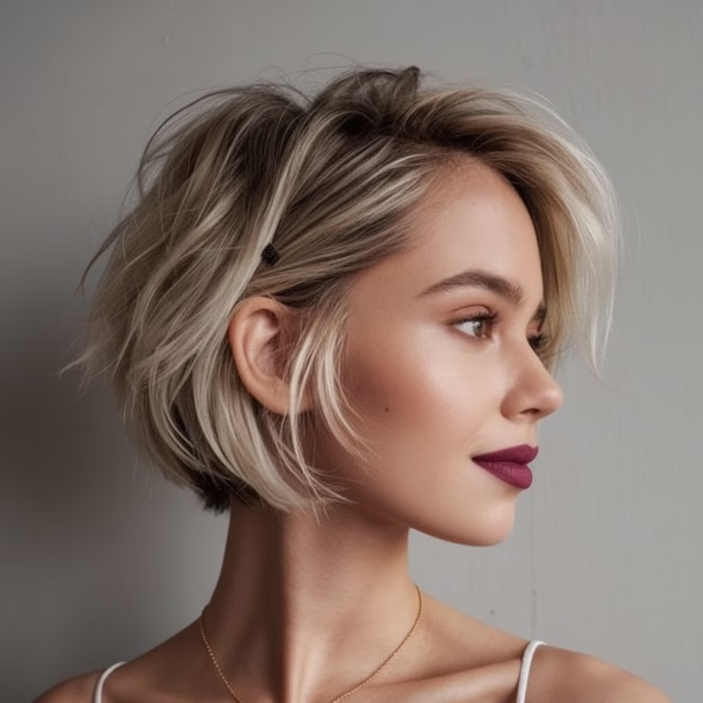 Der kurze Pony ist das Herzstück dieses Looks. Er verleiht dem French Bob seine charakteristische Note und sorgt für eine markante, aber nicht dominante Ausstrahlung. Statt das Gesicht zu verdecken, öffnet der Pony den Blick und lenkt die Aufmerksamkeit auf Augen und Gesichtszüge.
