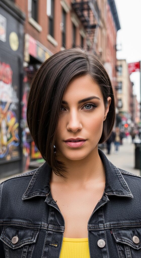 Mut zur Asymmetrie! Ein schräg geschnittener Bob schafft optisch Fülle und ist perfekt für experimentierfreudige Damen. Bonus: Einfach zu stylen und super modern!