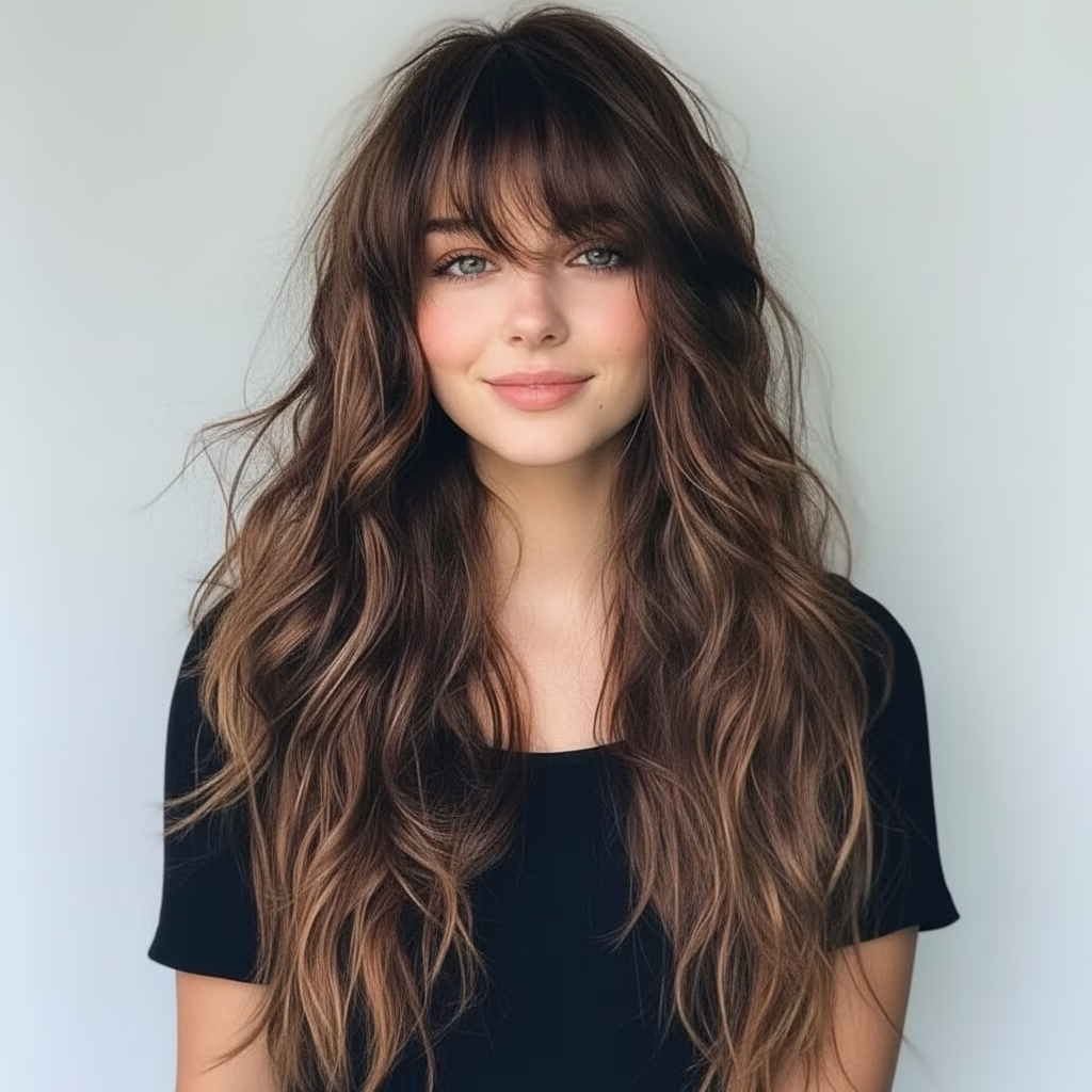 Während lange Haare oft mit Weichheit und Bewegung assoziiert werden, bringt der gerade Pony Struktur und Klarheit ins Gesamtbild. Genau diese Balance macht den Reiz dieser Frisur aus.