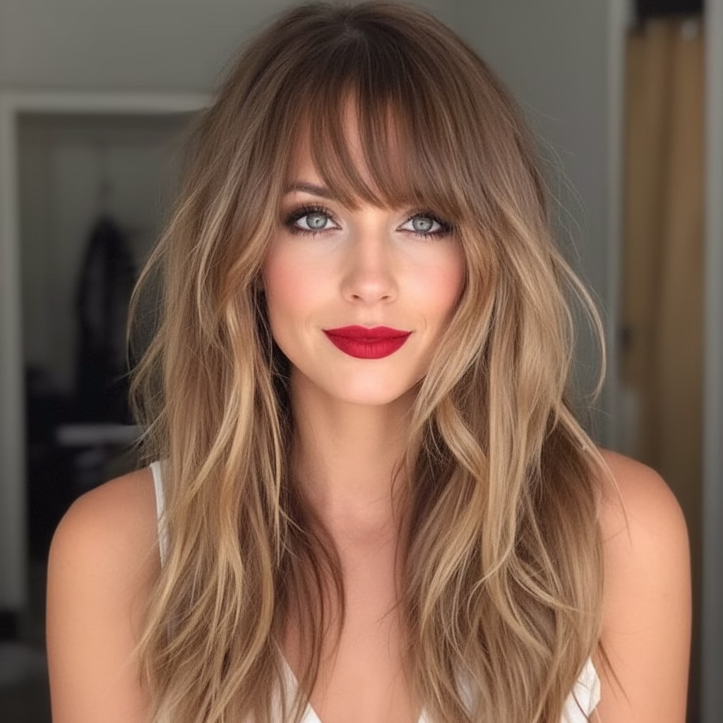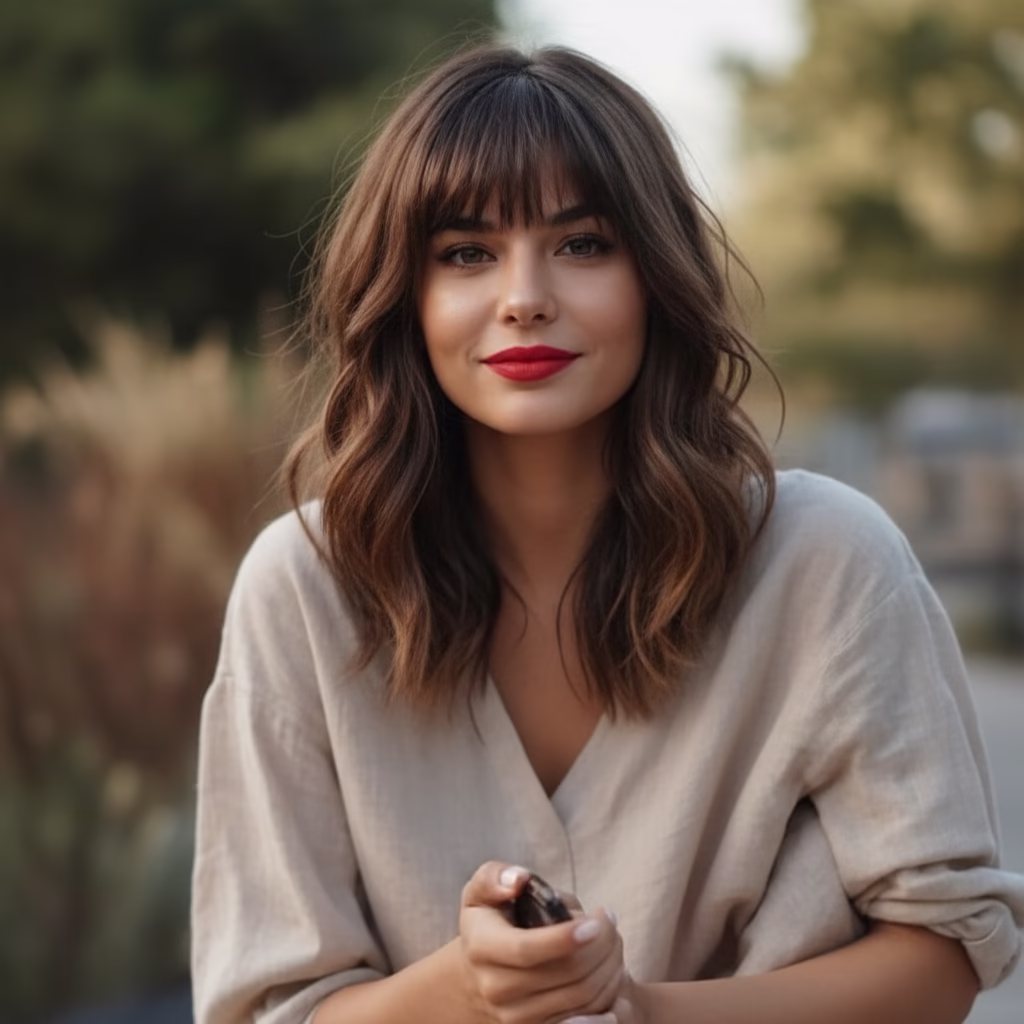 Die Kombination aus geradem Pony und langen Haaren gehört zu den ausdrucksstärksten Frisurenklassikern. Sie verbindet klare Linien mit fließenden Längen und schafft einen Look, der zugleich ruhig, elegant und selbstbewusst wirkt. Diese Frisur steht für Präzision im oberen Gesichtsbereich und für Weiblichkeit in der Länge – ein Zusammenspiel, das seit Jahrzehnten fasziniert.