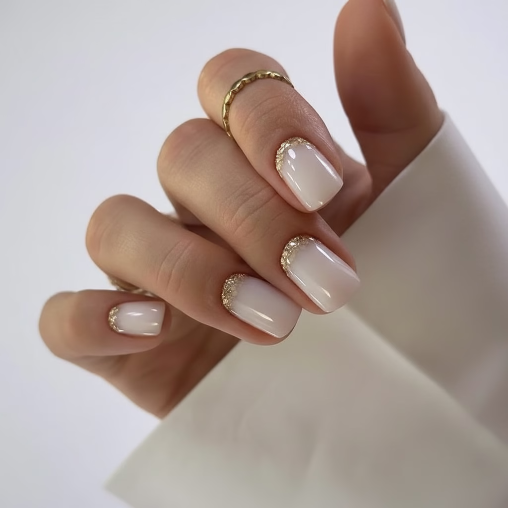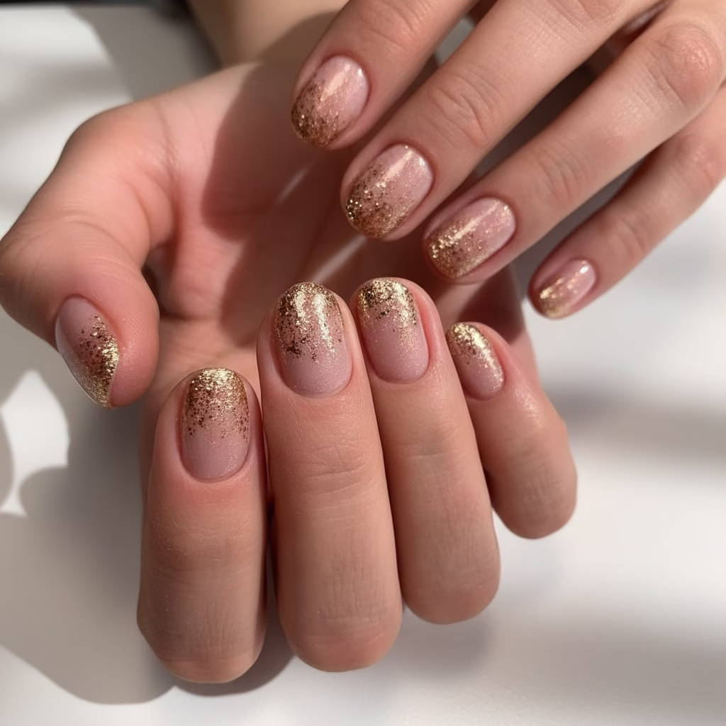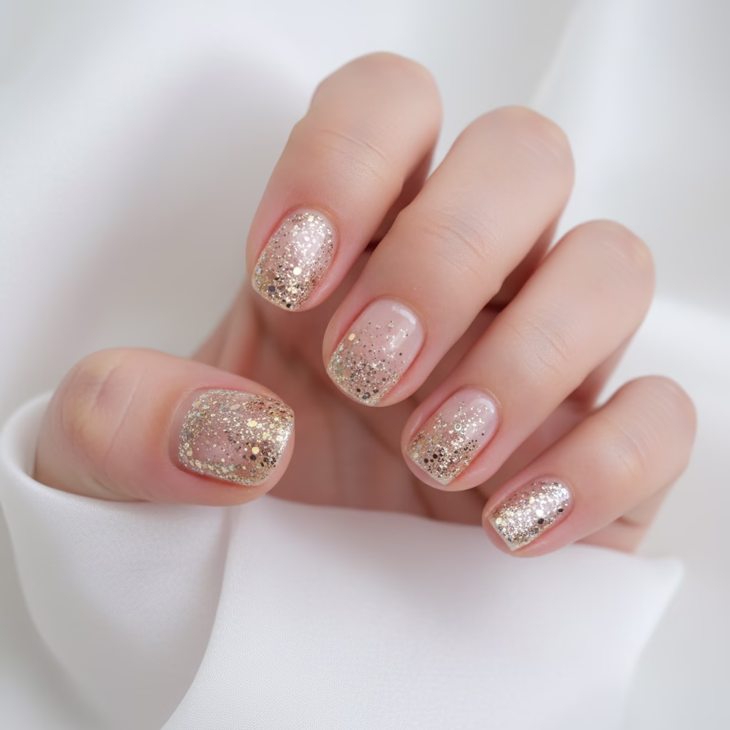 Kurze Nägel mit Glitzer vermitteln eine moderne Weiblichkeit. Sie wirken selbstbewusst, stilvoll und nicht abhängig von auffälliger Länge.