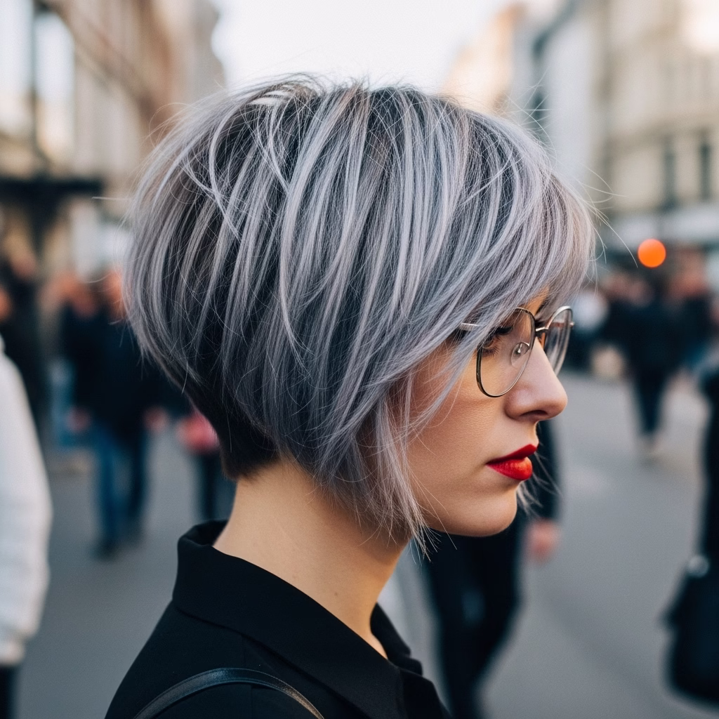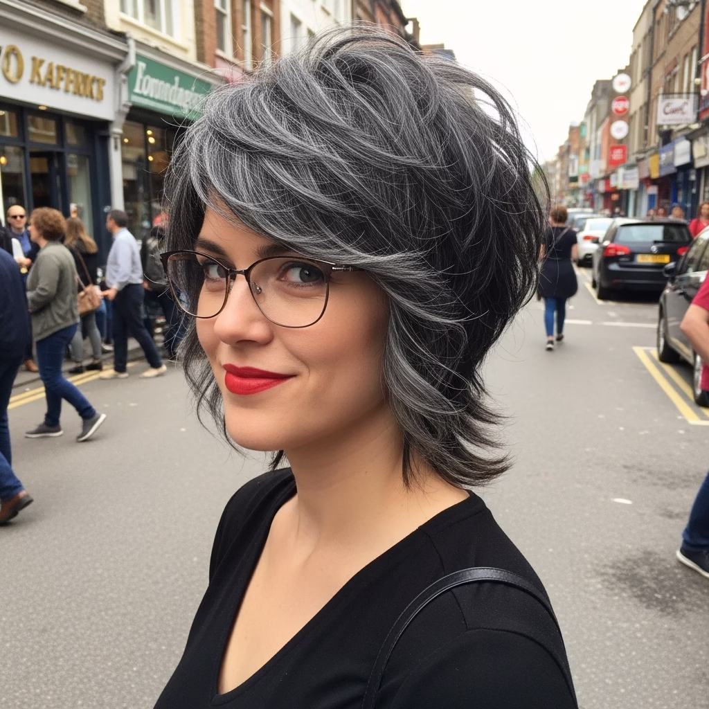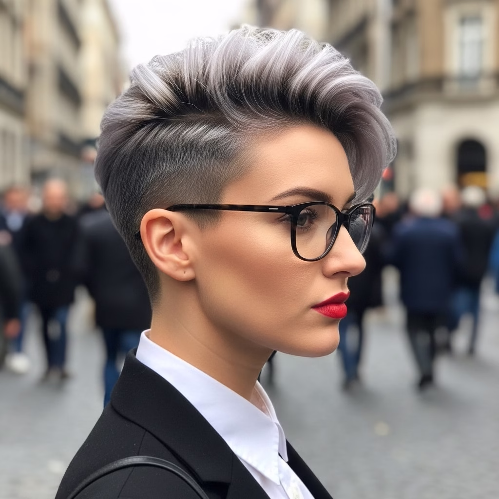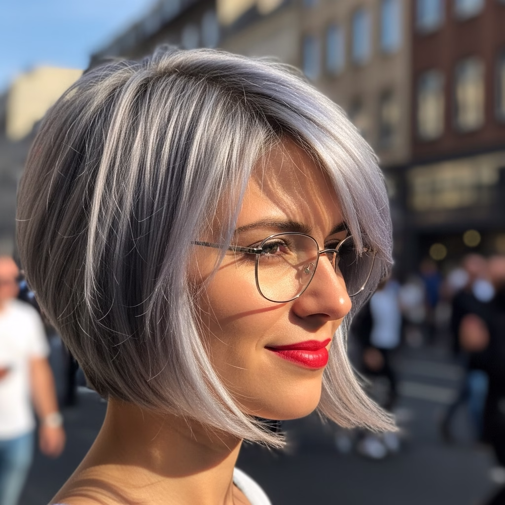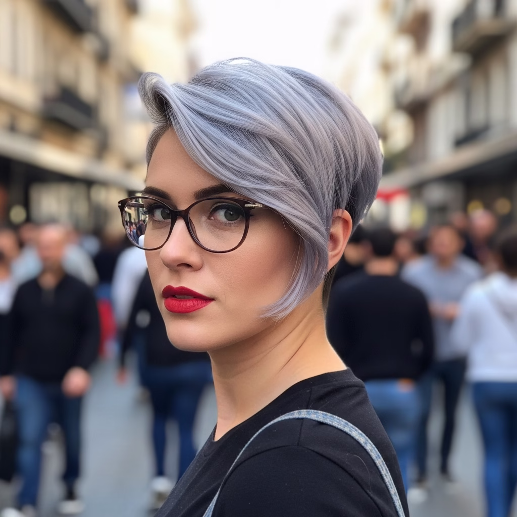 Graue Kurzhaarfrisuren mit Brille passen besonders gut zu urbanen Lebensstilen. Sie wirken kosmopolitisch, reflektiert und modern. Der Stil signalisiert Offenheit und kulturelles Bewusstsein.