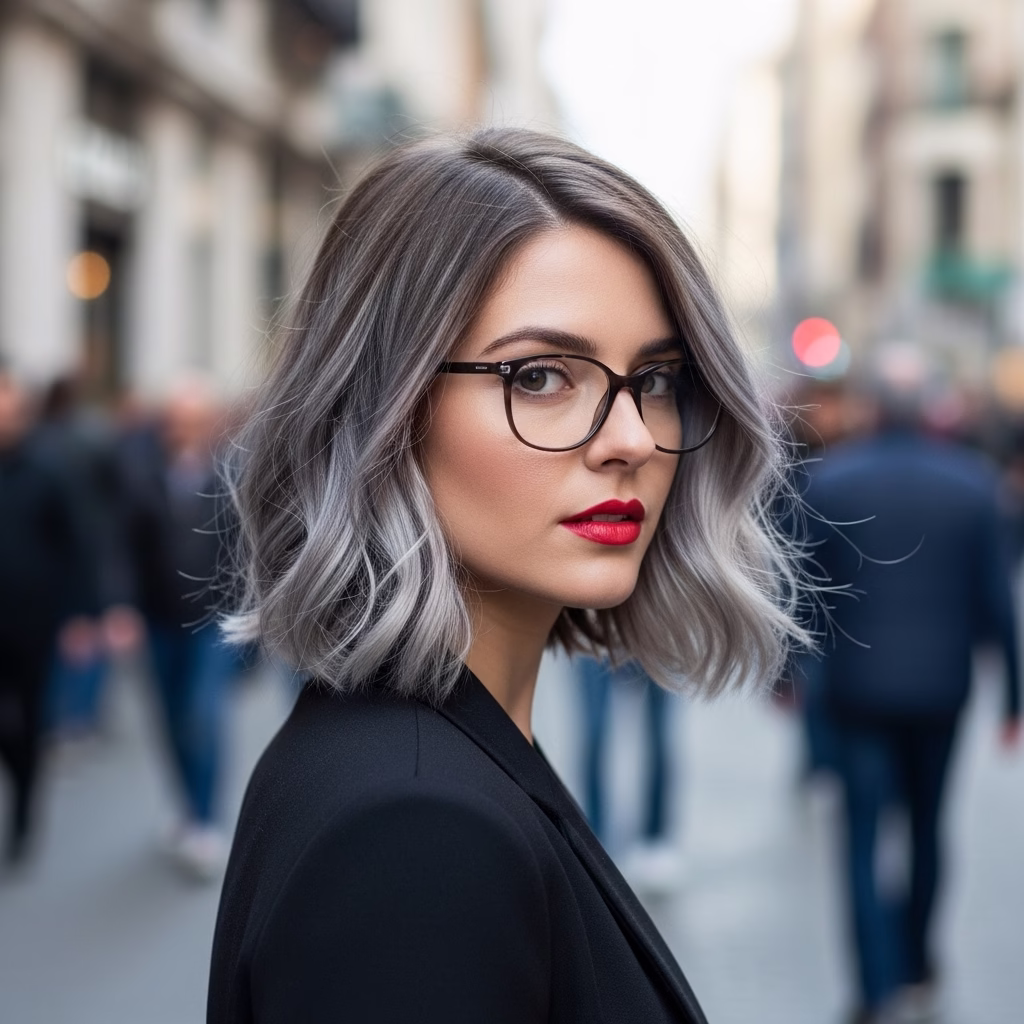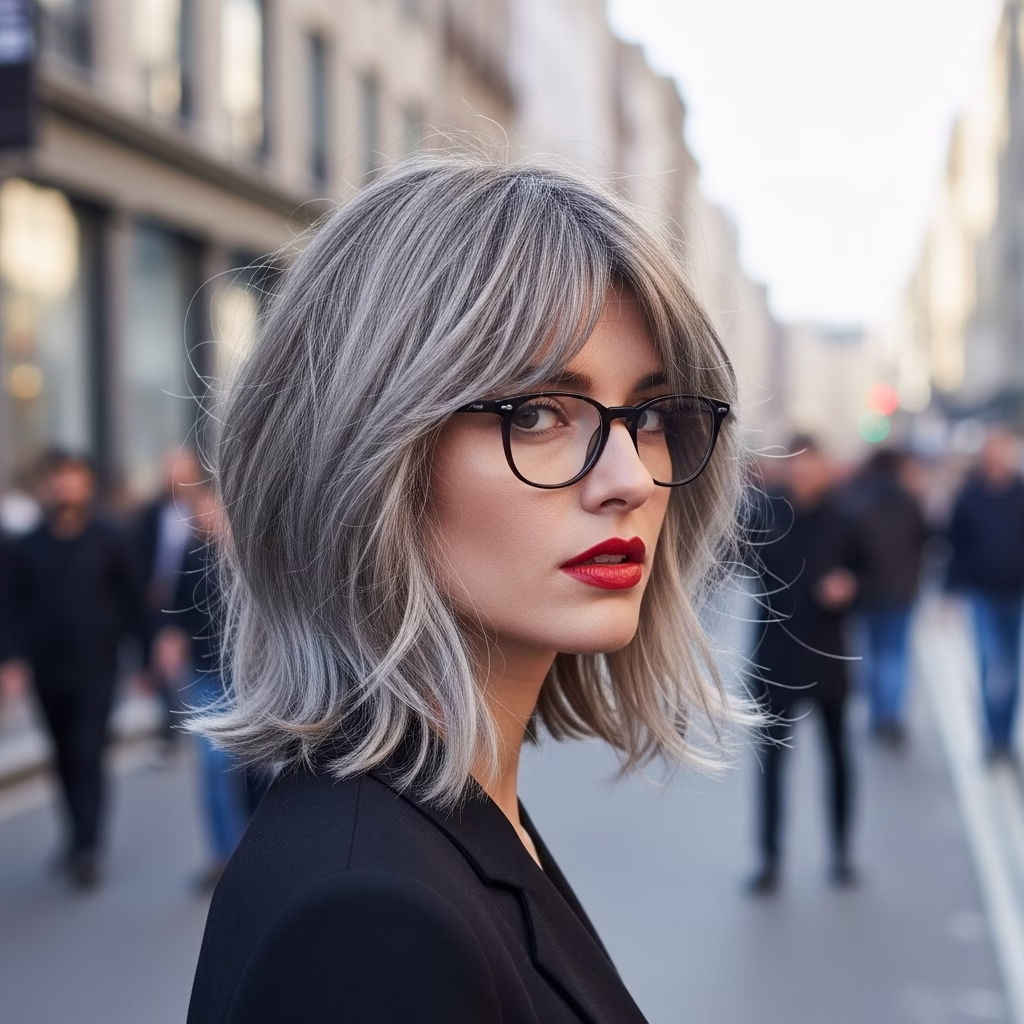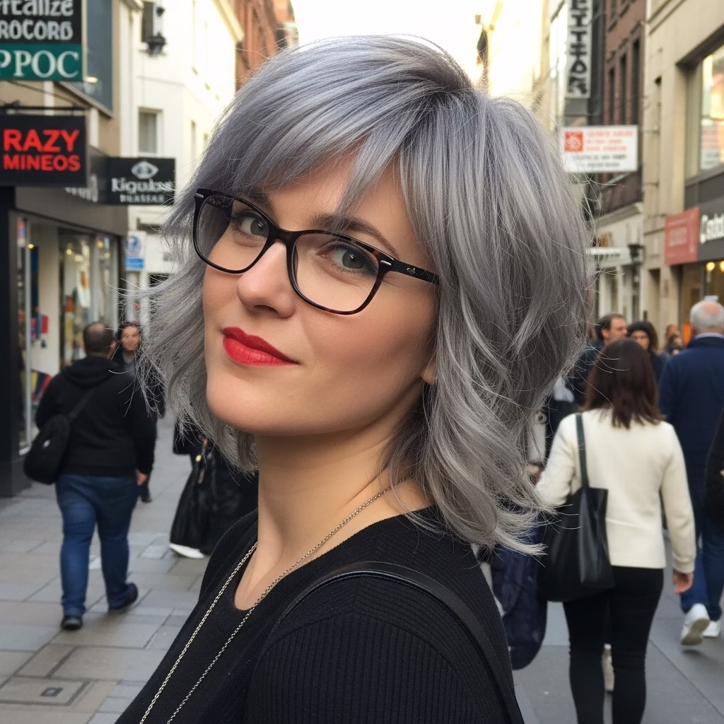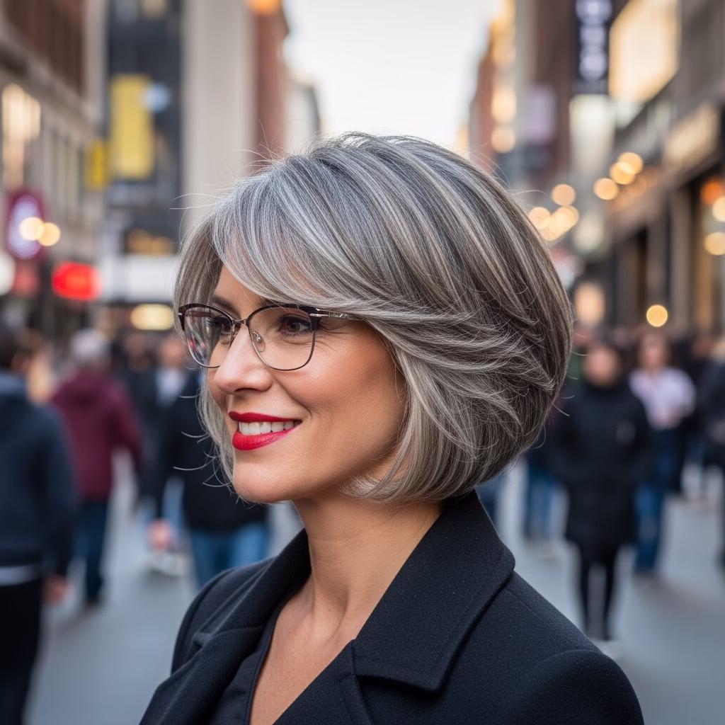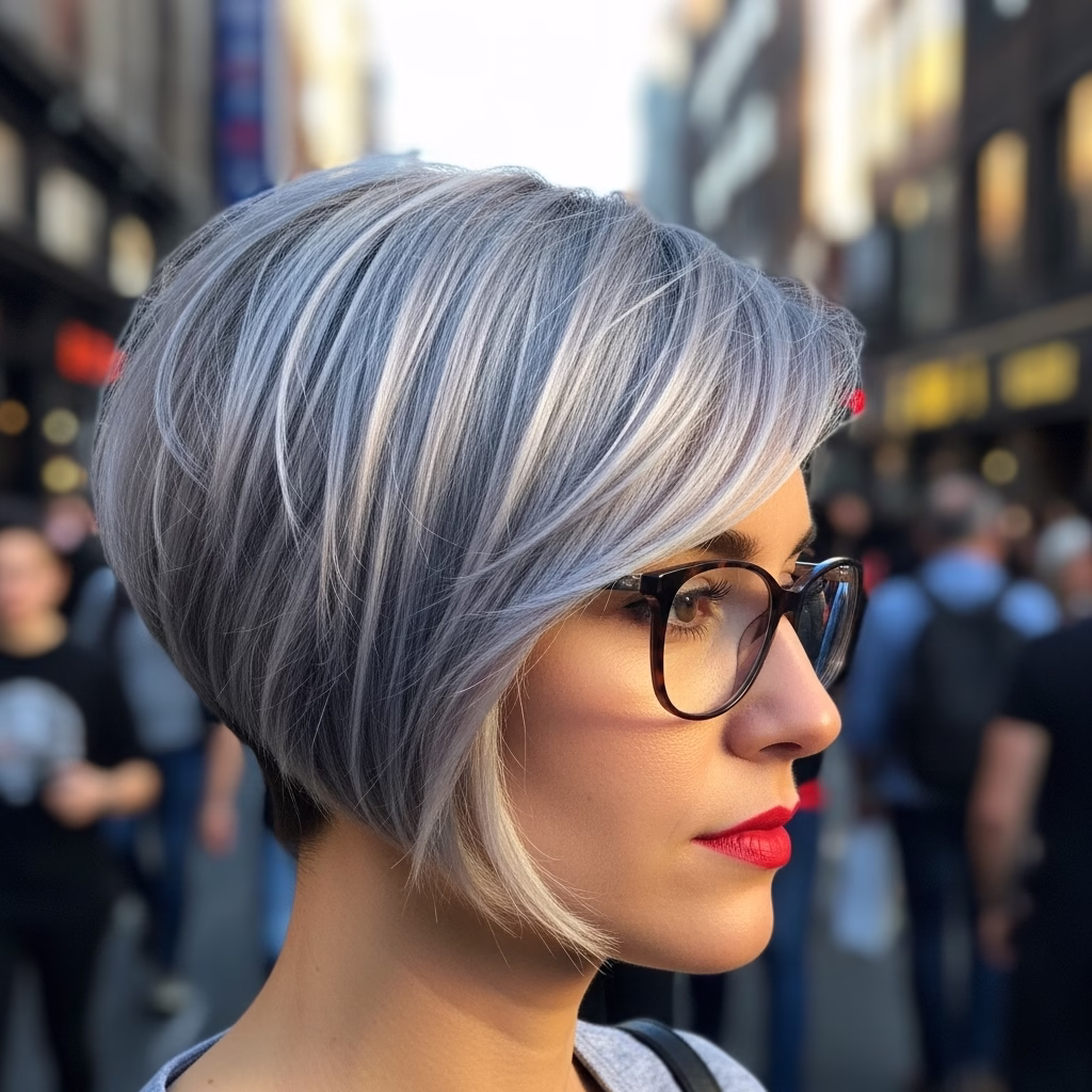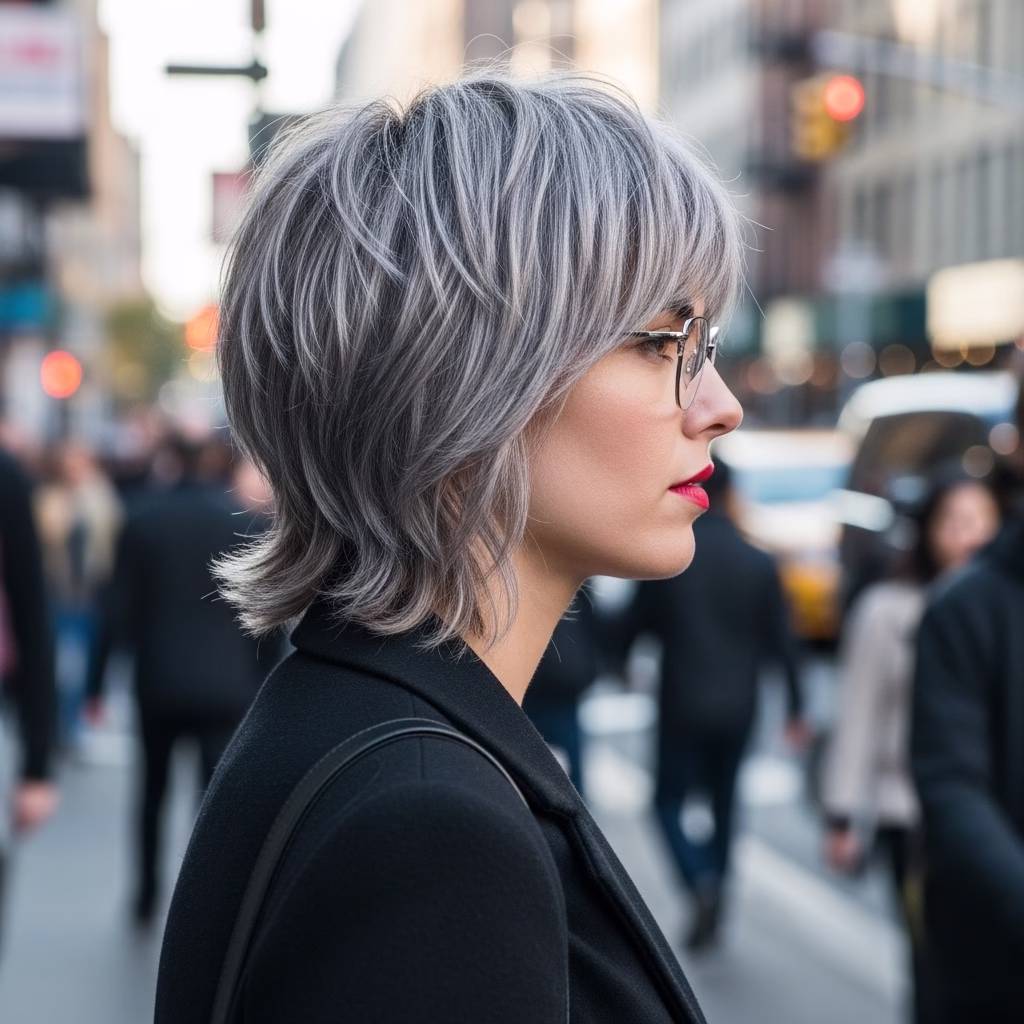 Graue Kurzhaarfrisuren mit Brille passen besonders gut zu urbanen Lebensstilen. Sie wirken kosmopolitisch, reflektiert und modern. Der Stil signalisiert Offenheit und kulturelles Bewusstsein.