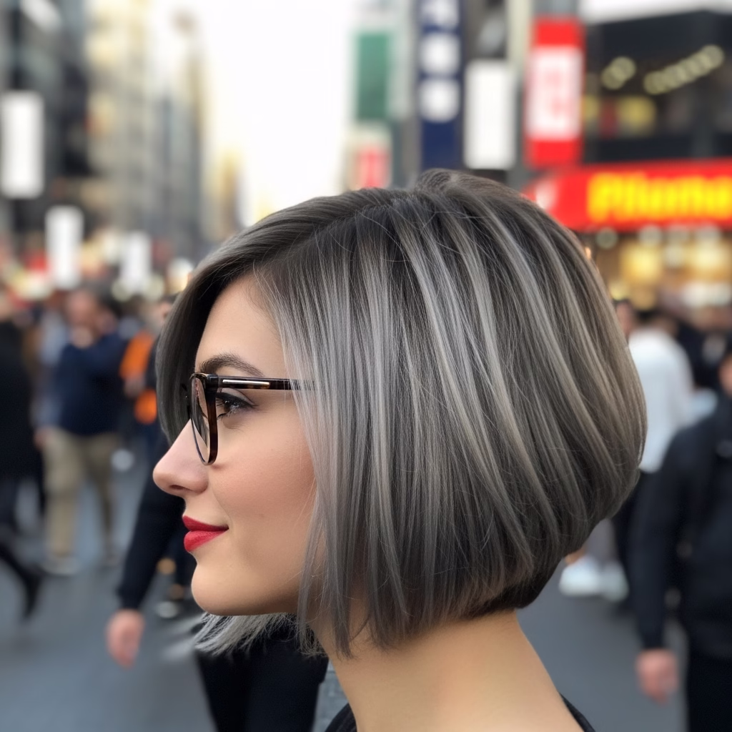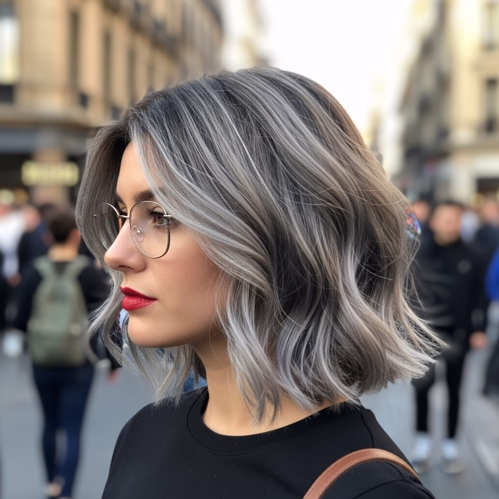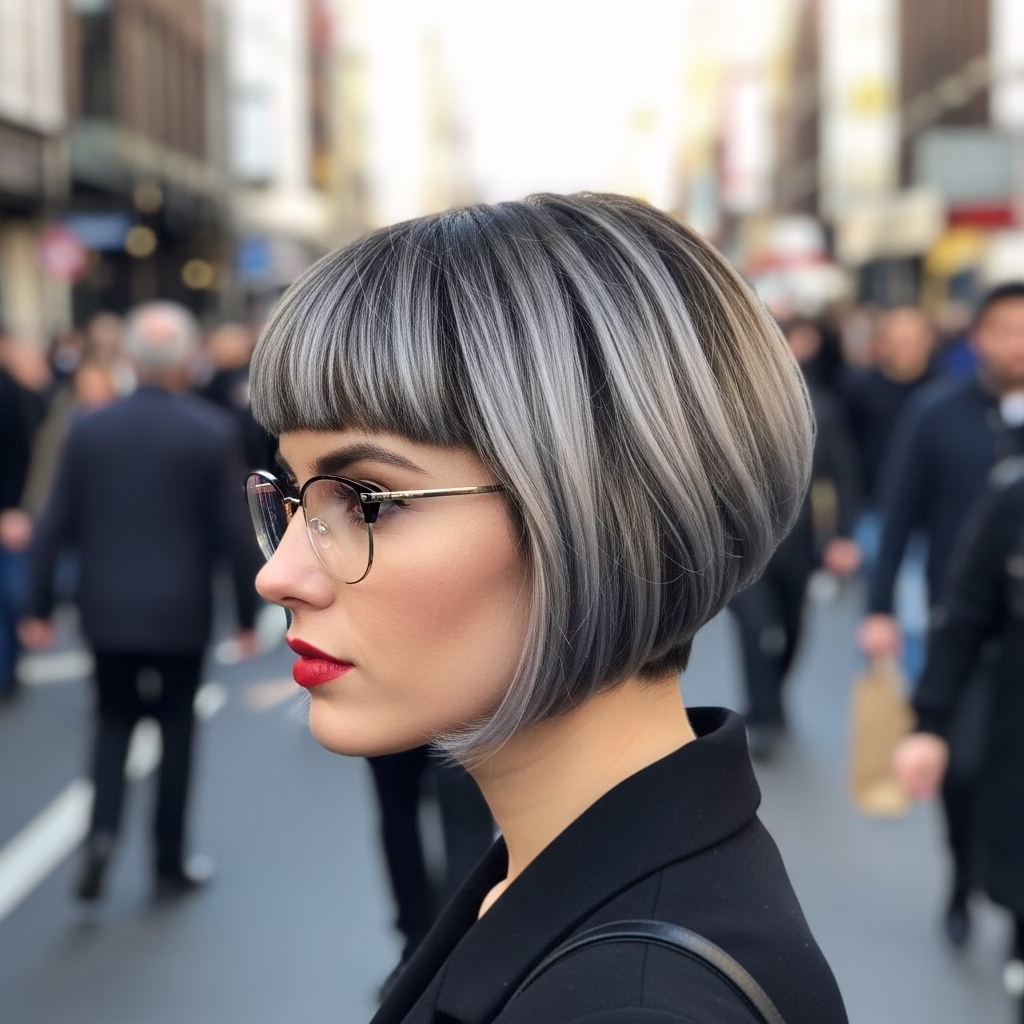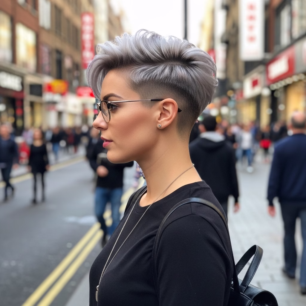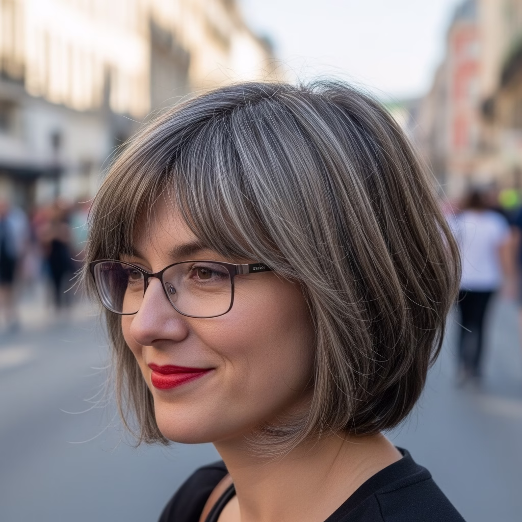 Graue Kurzhaarfrisuren mit Brille passen besonders gut zu urbanen Lebensstilen. Sie wirken kosmopolitisch, reflektiert und modern. Der Stil signalisiert Offenheit und kulturelles Bewusstsein.
