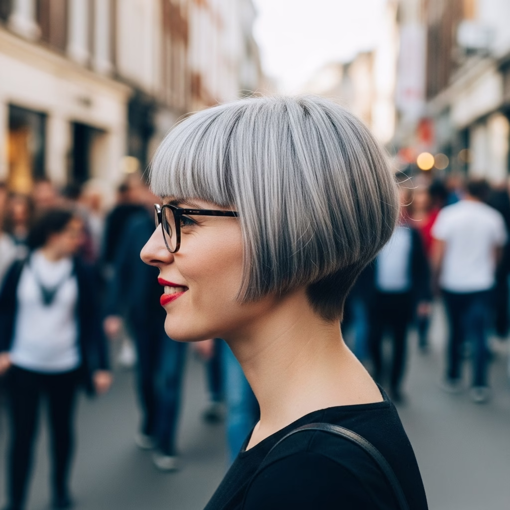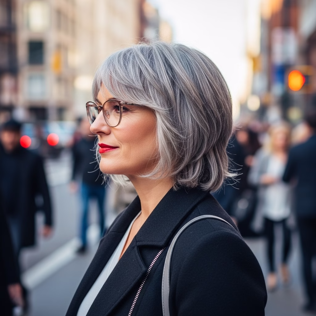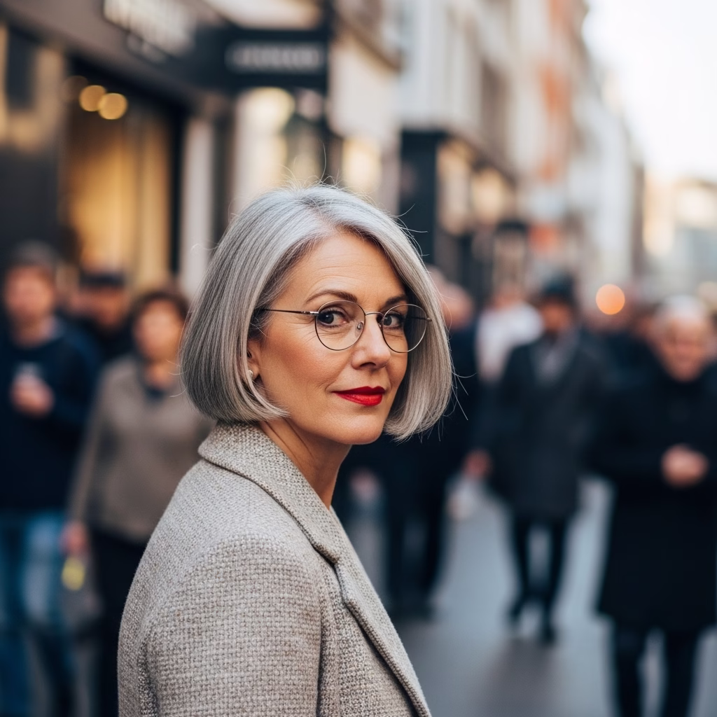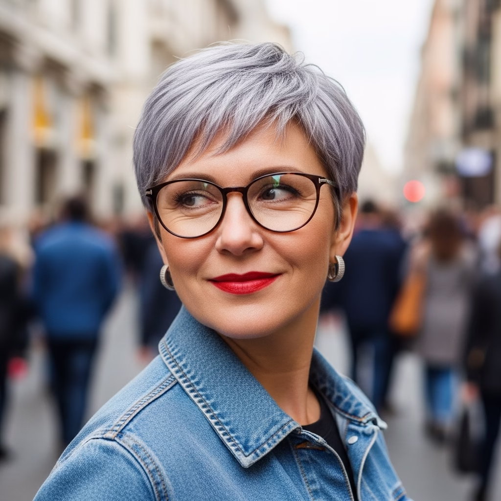 Viele Frauen entscheiden sich bewusst für kurze Frisuren, weil sie Freiheit und Selbstbestimmung symbolisieren. In Verbindung mit grauem Haar und Brille verstärkt sich dieser Eindruck. Der Look wirkt unabhängig, modern und reflektiert.