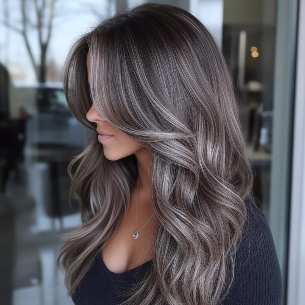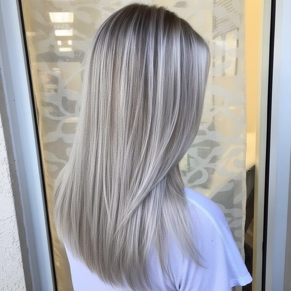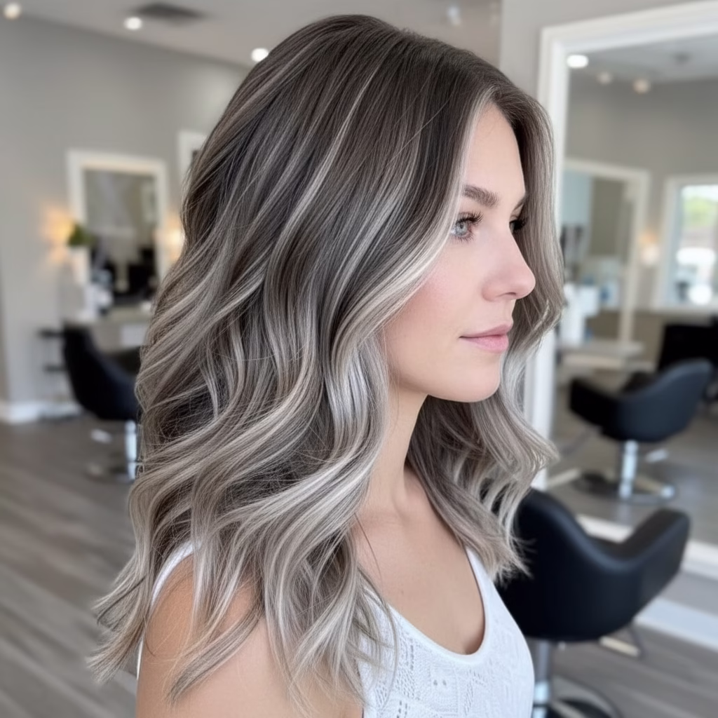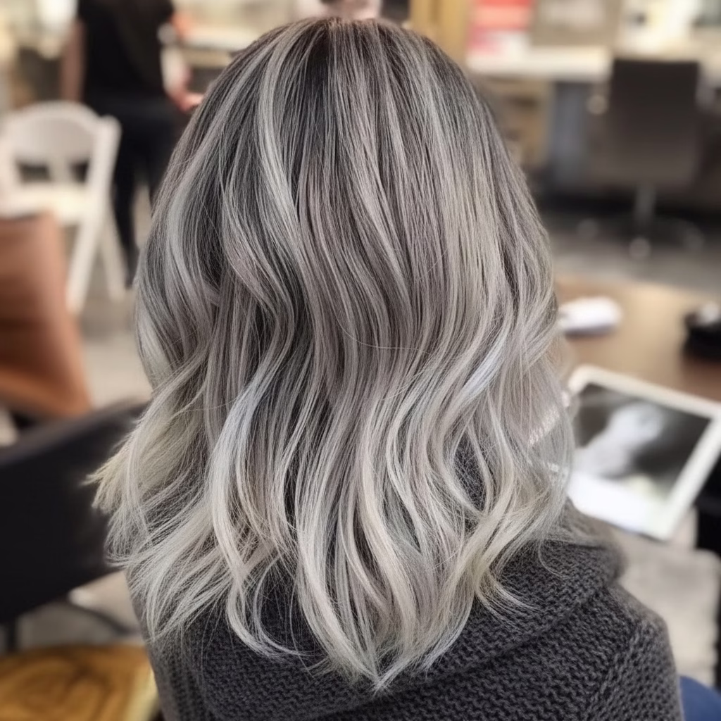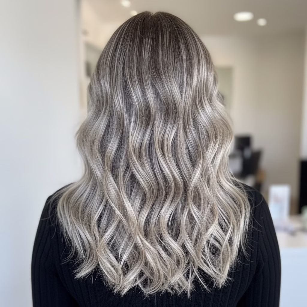 Blondes Haar bildet die ideale Grundlage für graue Akzente. Die kühlen Nuancen setzen sich sanft ab und sorgen für Tiefe, ohne hart zu wirken. Das Zusammenspiel aus hellen und silbrigen Tönen verleiht der Frisur Struktur und visuelle Klarheit.