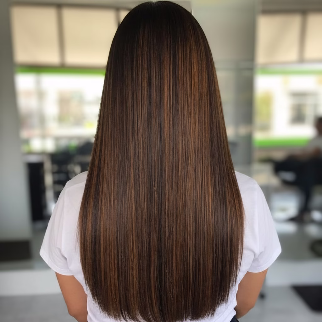 Glatte Haare haben eine besondere Eigenschaft: Sie reflektieren Licht auf eine viel intensivere Weise als Locken oder Wellen. Deshalb wirken Highlights in glattem braunem Haar besonders elegant und hochwertig. Jeder einzelne Farbreflex hebt die Struktur hervor und verleiht dem Haar einen sanften, spiegelnden Glanz.
