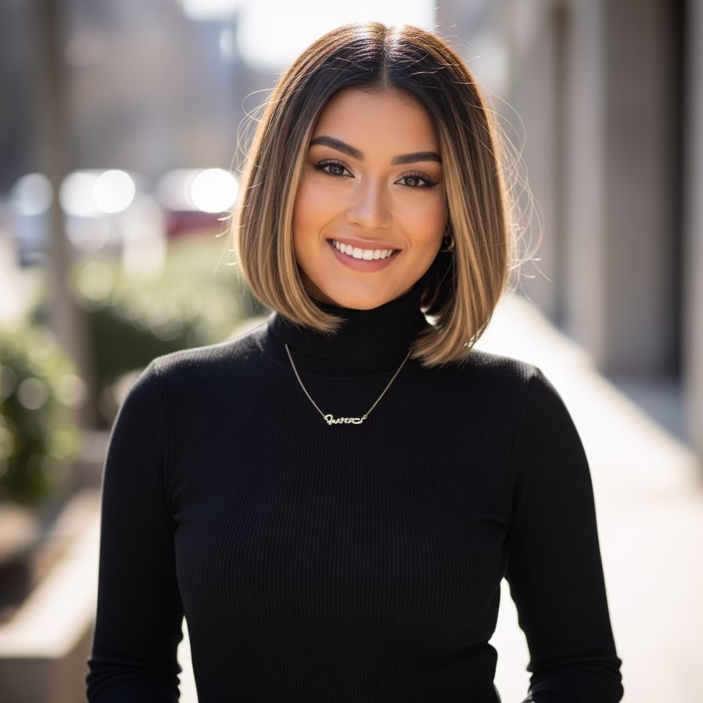 Gezielte helle Strähnen in der vorderen Haarpartie öffnen das Gesicht und setzen Highlights genau dort, wo sie am stärksten zur Geltung kommen. Dieser Trend ist besonders beliebt, weil er unglaublich schmeichelhaft wirkt.