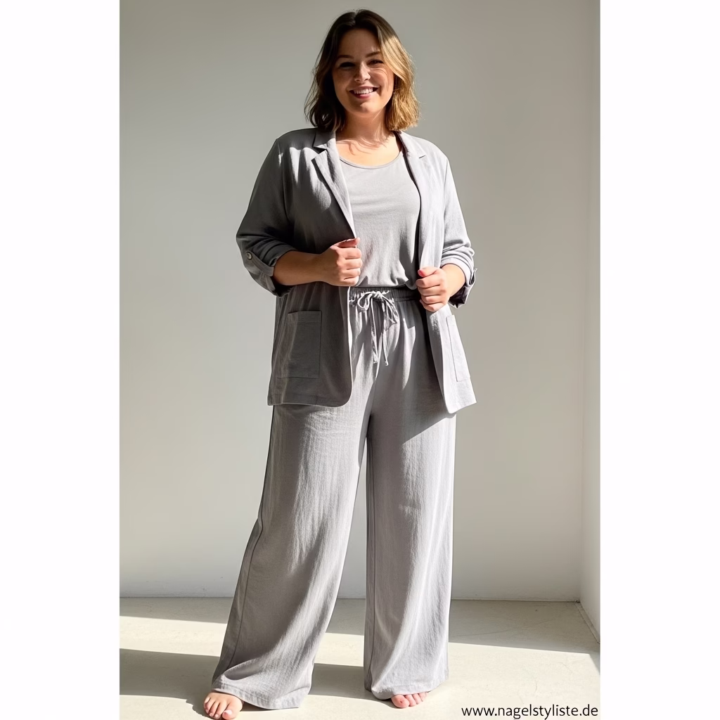 Bei Plus-Size-Hosenanzügen spielen Proportionen eine zentrale Rolle. Ober- und Unterteil stehen in einem ausgewogenen Verhältnis zueinander. Diese Balance sorgt für ein harmonisches Gesamtbild und unterstreicht die natürliche Silhouette auf dezente Weise.