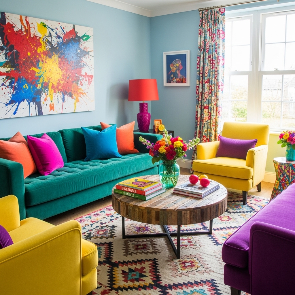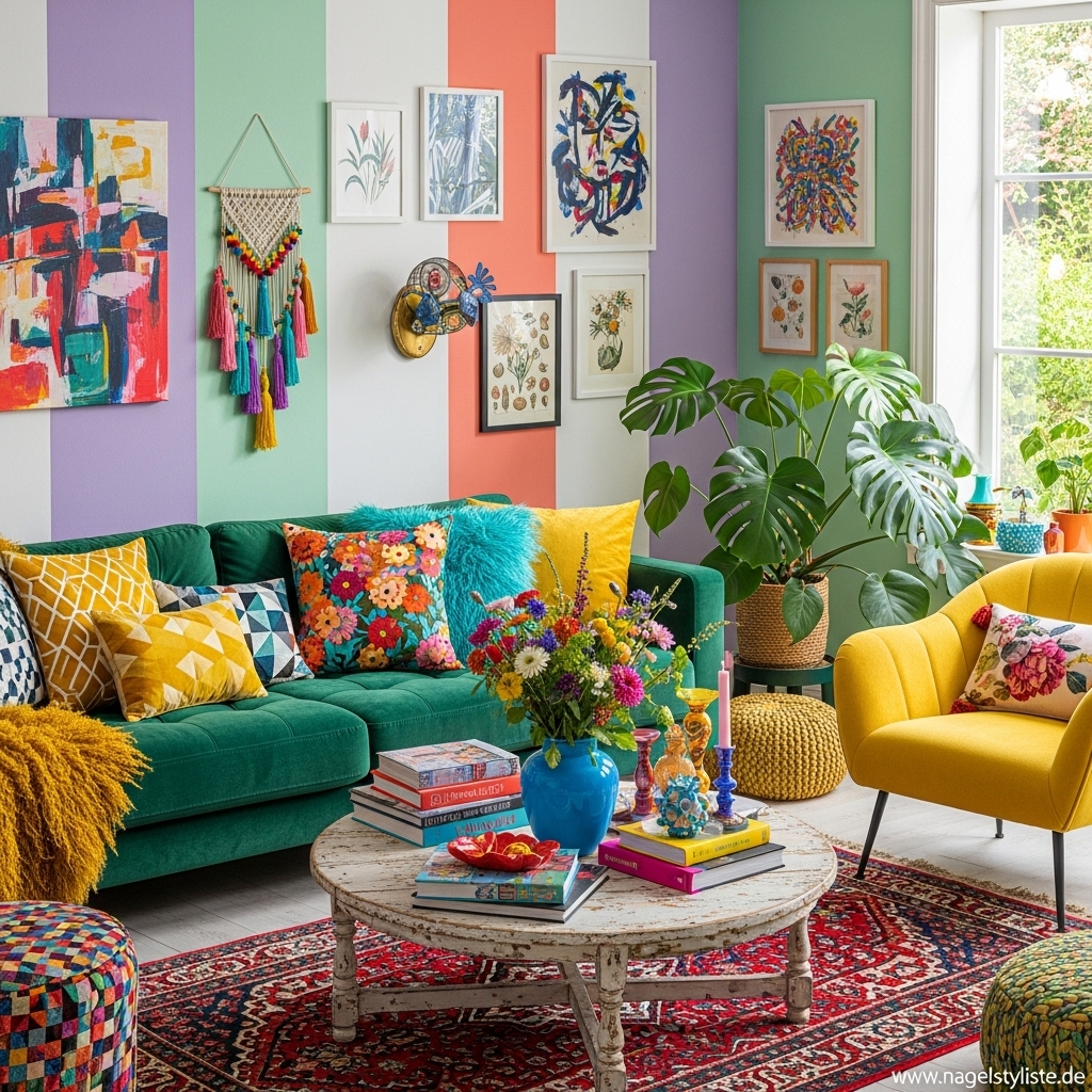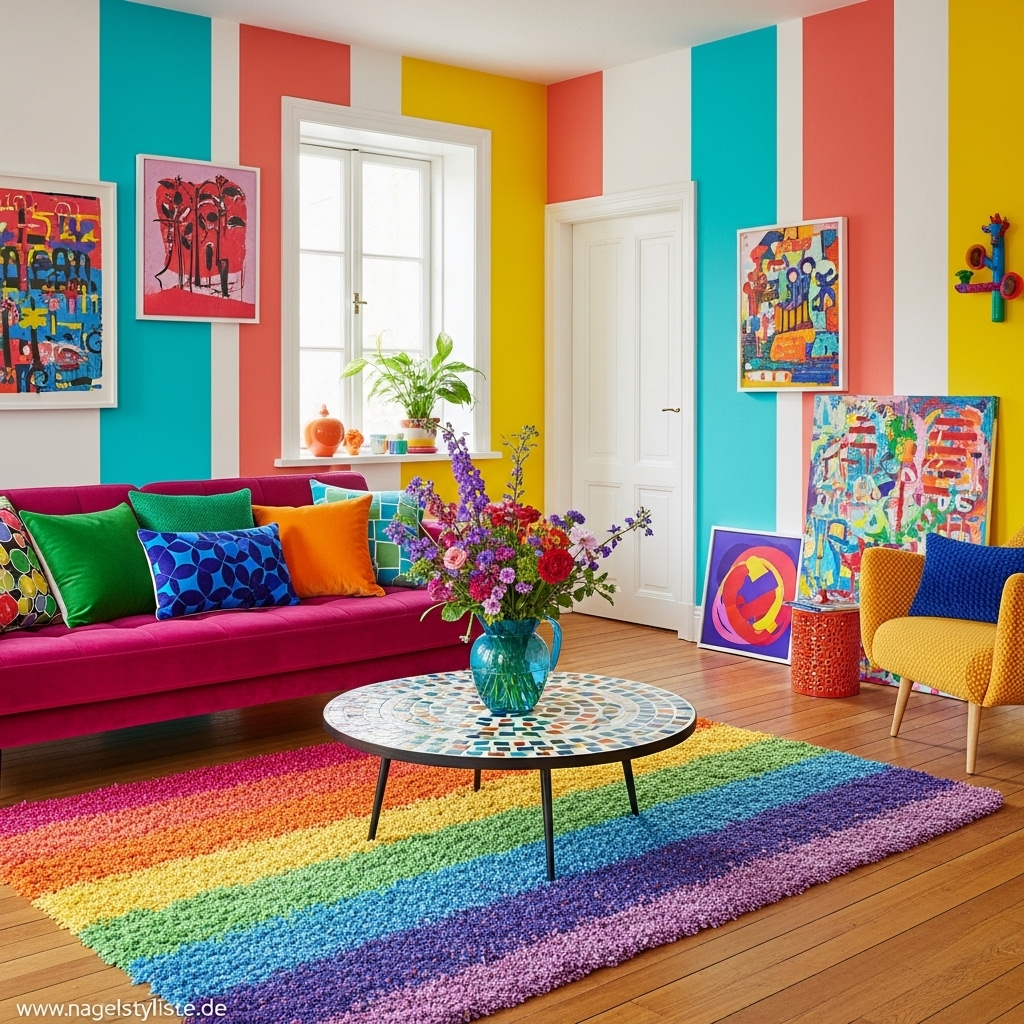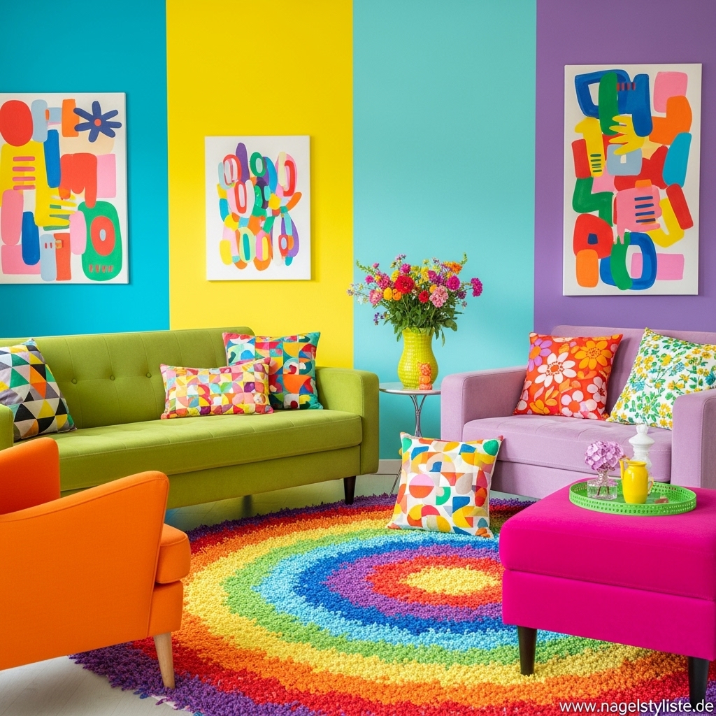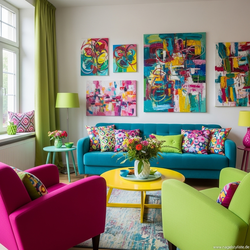 Bunte Wohnzimmer lassen sich mit unterschiedlichen Stilrichtungen kombinieren – von modern bis verspielt.