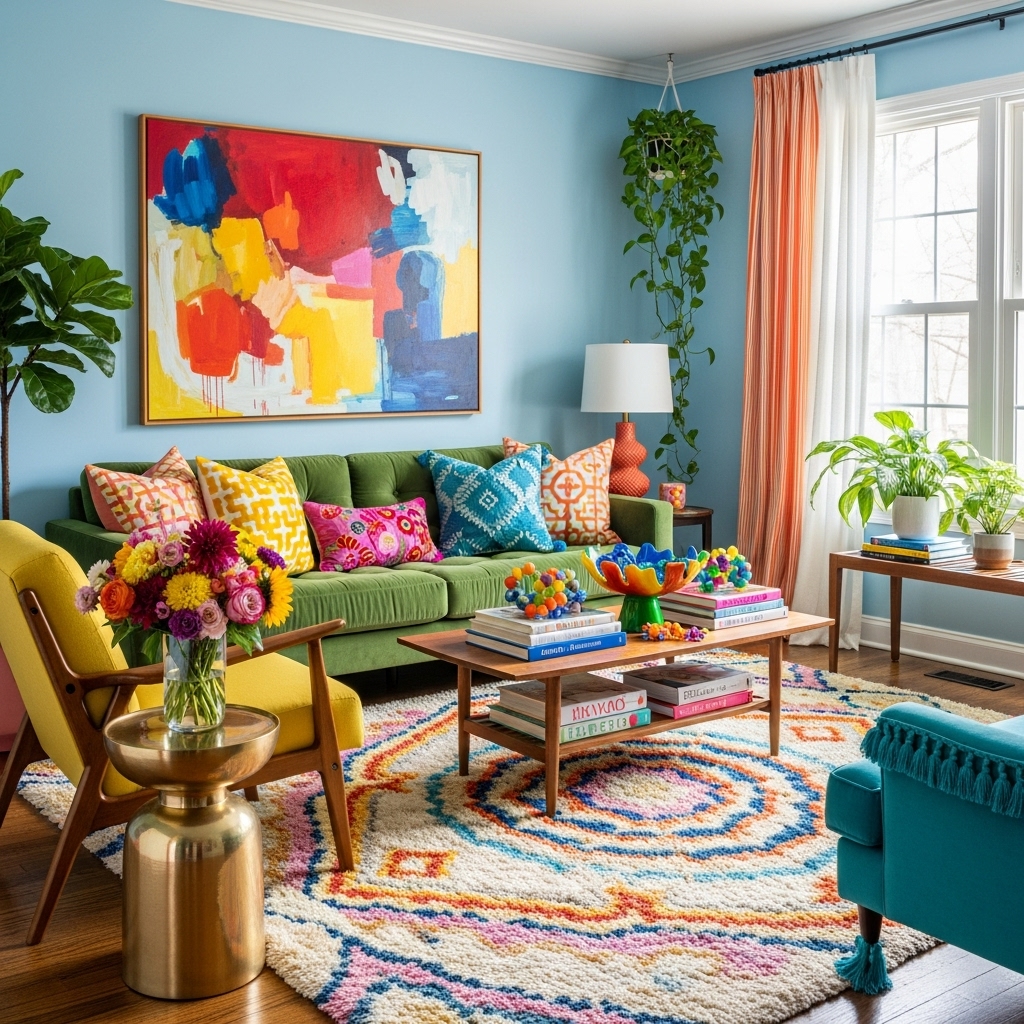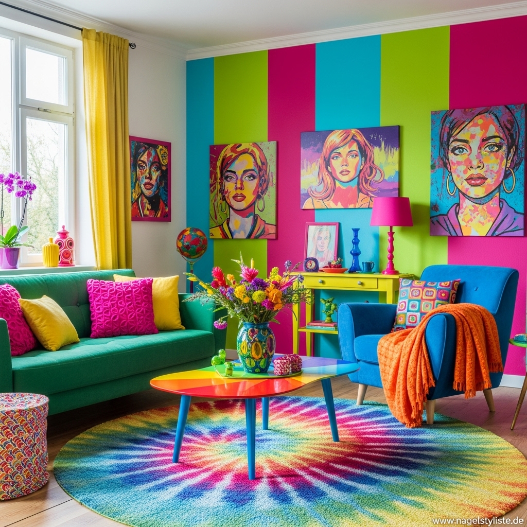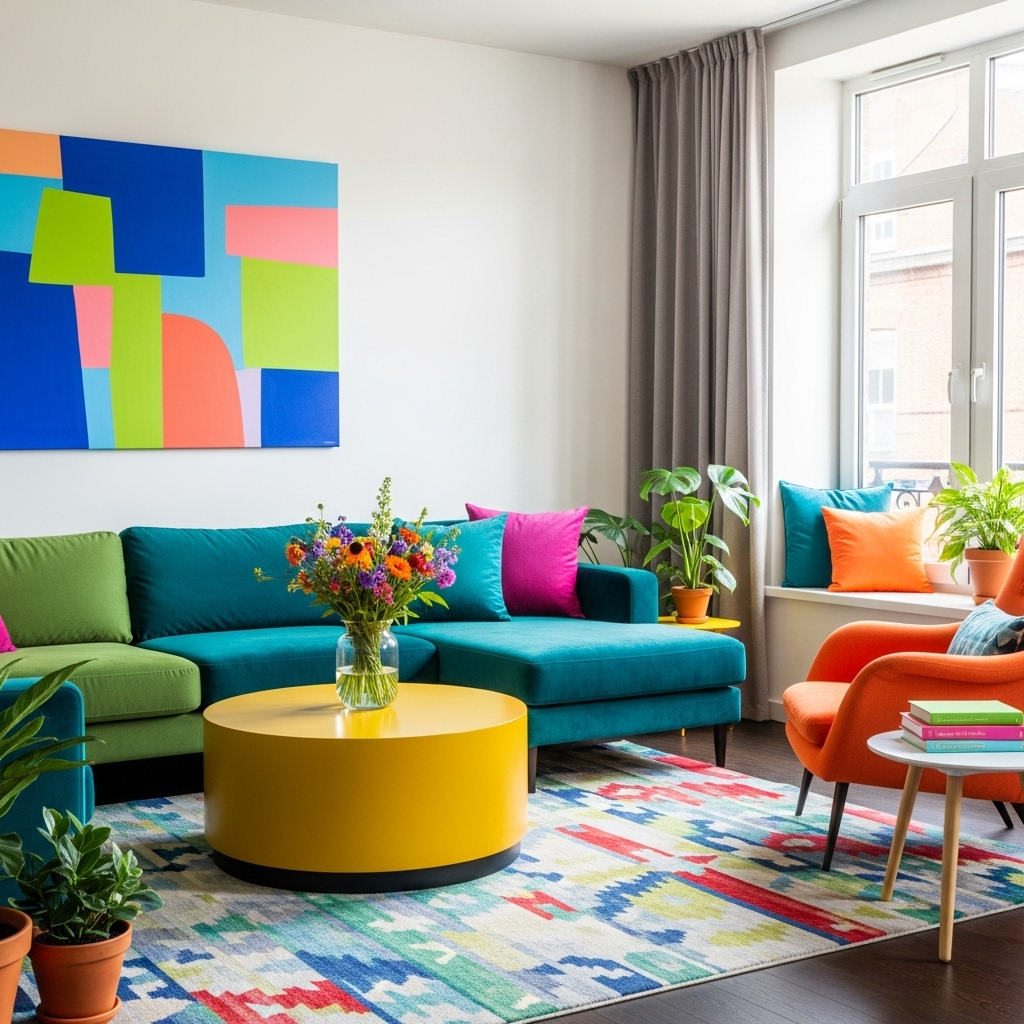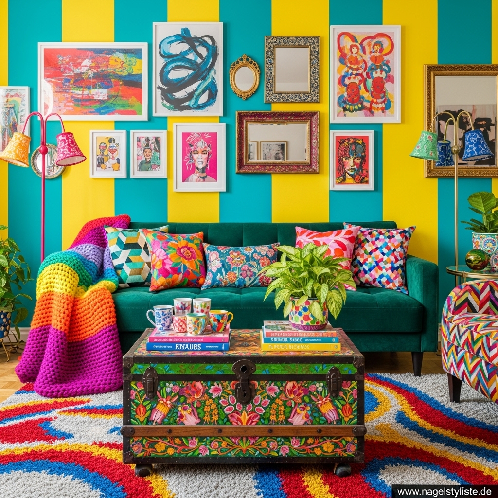 Bunte Wohnzimmer lassen sich mit unterschiedlichen Stilrichtungen kombinieren – von modern bis verspielt.