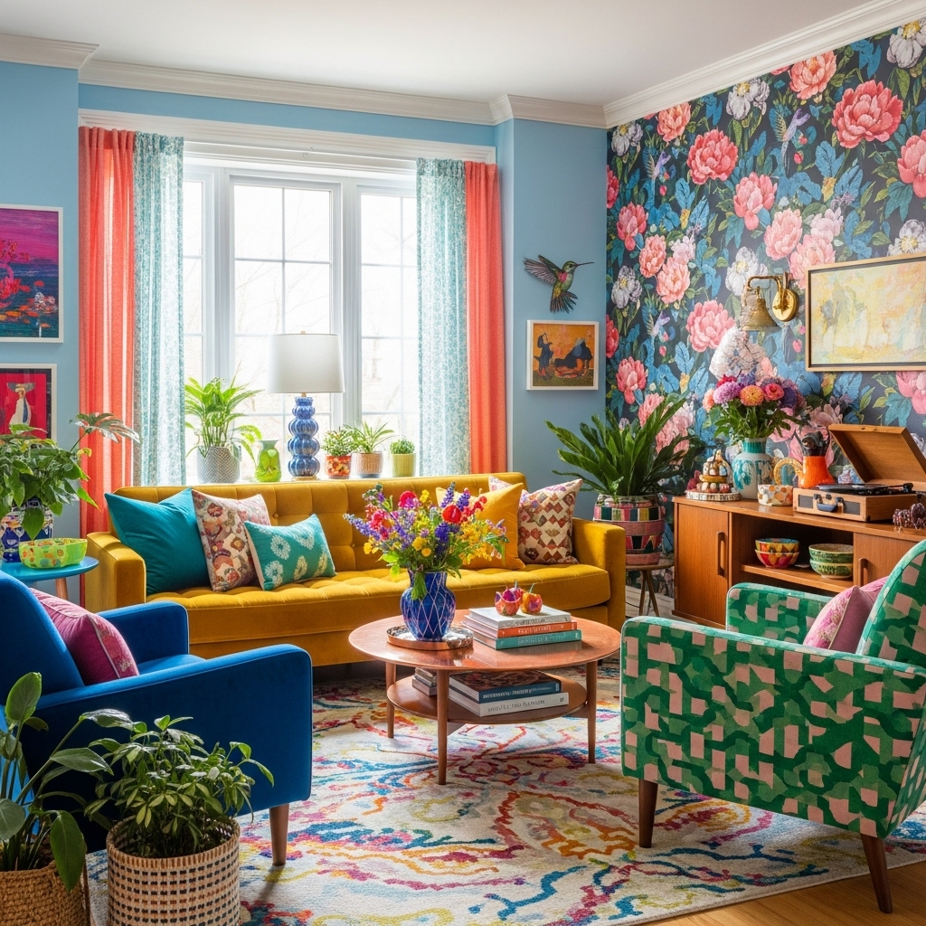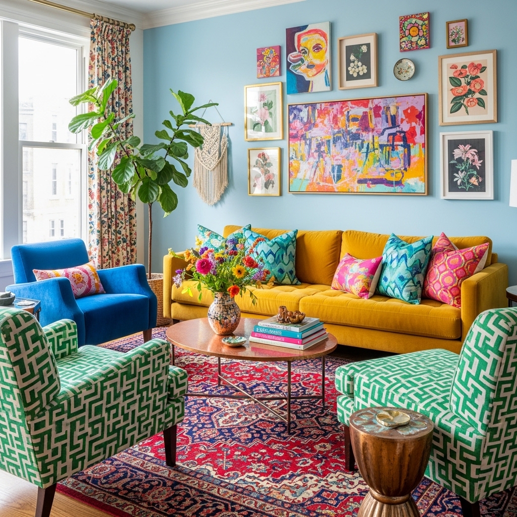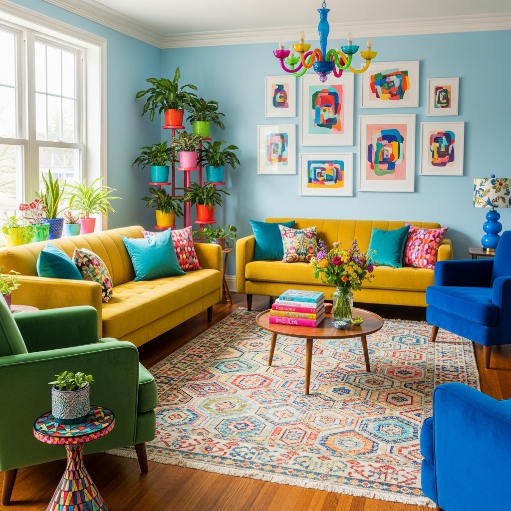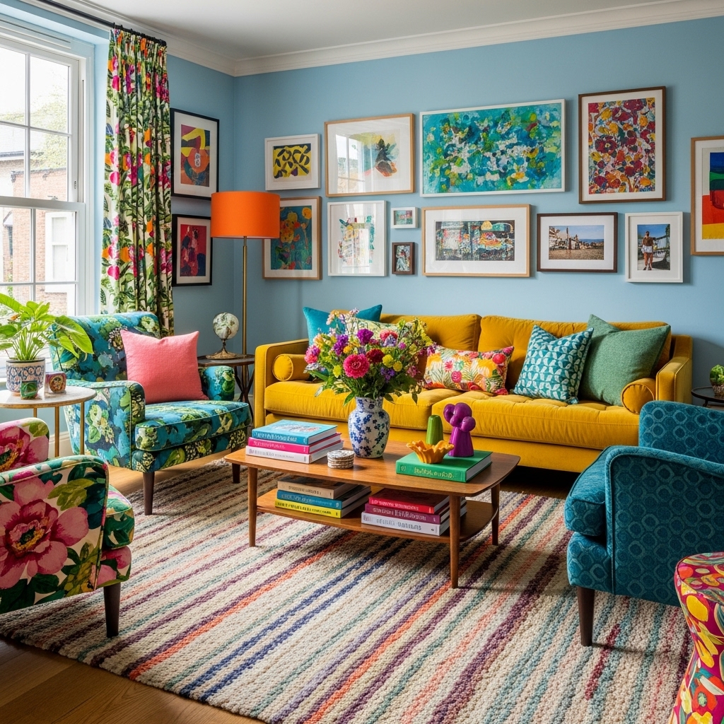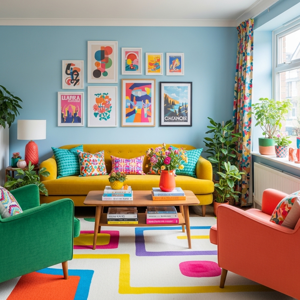 Bunte Wohnzimmer lassen sich mit unterschiedlichen Stilrichtungen kombinieren – von modern bis verspielt.
